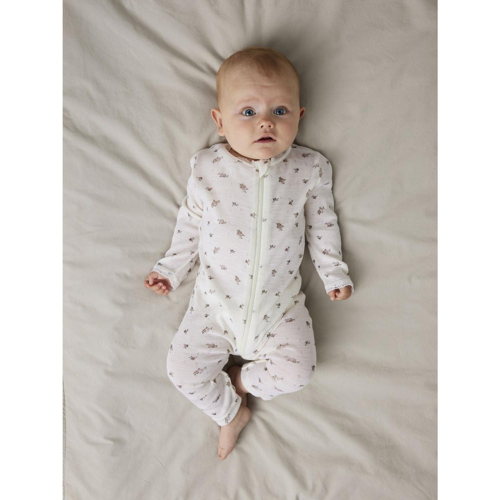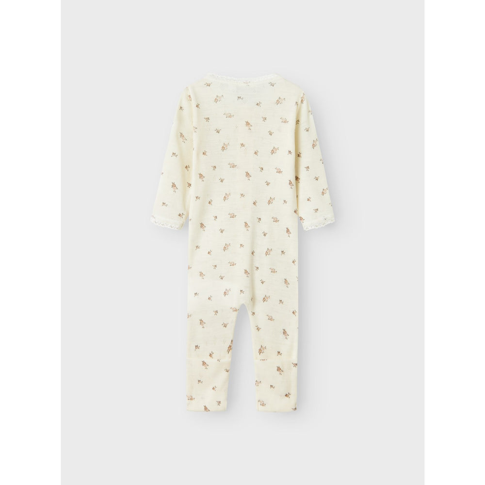 Introduce your little one to the cozy embrace of our Name It Snow White Small Flowers Nbfwang Wool Needle Nightsuit Noos. Crafted from soft, warm wool, this sleepsuit ensures year-round comfort with its unique needle drop design featuring charming dropped stitches for distinctive patterns. Adorned with a delicate, all-over floral print and cute lace details, it comes in a stylish Snow White color, enhancing its enchanting appeal. The full-length zip fastening, long sleeves, and clever hems that fold over the feet promise easy wearability and extra warmth during chilly nights. Easy to care for, this nightsuit blends comfort with enchanting style, making it an ideal choice for peaceful slumber or joyful play at home. Closure: Zip fastening Materials: 100% Wool (Merino Wool) Materials and care: Max shrinkage 8%. Only use silk or wool detergent Washing instructions: Maximum Washing Temperature 30°C - Gentle Process