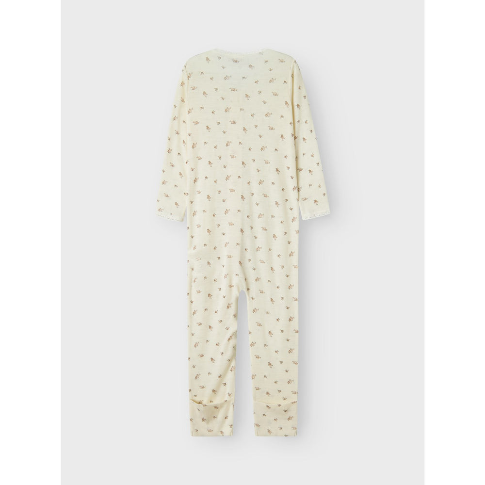 Introduce your little one to the charming comfort of our Name It Snow White Small Flowers Nmfwang Wool Needle Nightsuit. Crafted from soft, cozy wool, this sleepsuit ensures your child stays comfortable throughout the year. Featuring the unique needle drop technique, it showcases adorable dropped stitches that create delightful patterns across the fabric. The all-over small flower print adds a whimsical touch, perfect for nighttime adventures in dreamland. Designed with convenience in mind, it includes a zip fastening for easy changes, long sleeves for extra warmth, and cleverly designed hems that fold over the feet. The added lace detail provides a soft, elegant finish. Perfect for peaceful slumbers or playful daytime naps, this nightsuit blends style, comfort, and functionality effortlessly.
