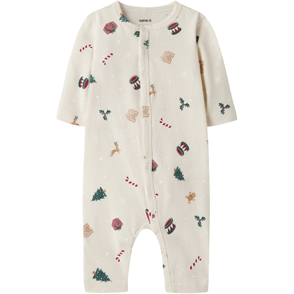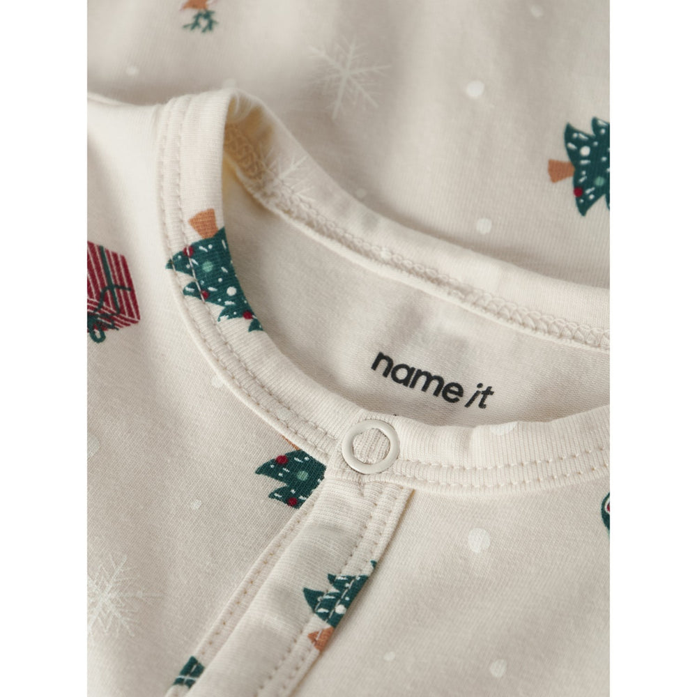 Dress your little one in the joy of the season with the Name It Whitecap Gray Xmas AOP Nbnvismas Ls Nightsuit. This snug sleepsuit is made from jersey, a soft and stretchy fabric that ensures comfort and freedom of movement. Featuring a charming Christmas print that covers the entire garment, it comes with long sleeves and convenient press stud fastening for easy changing. It is essential to note, for your child's safety, to keep this garment away from fire. Delight in the durable, easy-care material that makes nighttime or playtime equally joyful. Perfect for infusing your child’s bedtime with holiday spirit! Closure: Press Stud Materials: 95% Cotton, 5% Elastane