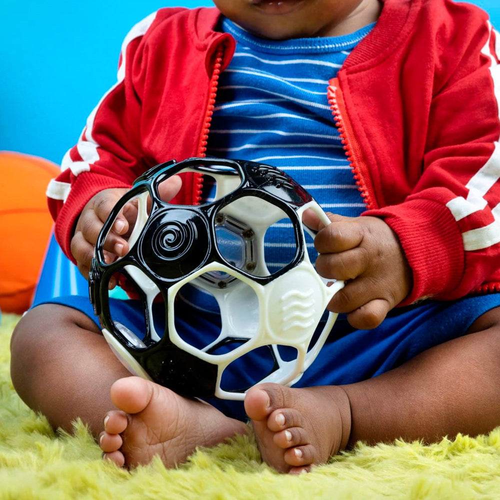 Delight your little one with the Oball Soccer Football in classic black and white! Crafted with innovative Bright Starts Obal technology, this football rattle boasts a flexible and durable design, making it effortless for tiny hands to grip through its numerous holes. Ideal for throwing, rolling, shaking, and kicking, it not only entertains but also enhances fine motor skills. Lightweight and easy to carry, this charming ball is perfect for on-the-go fun and suitable right from birth, ensuring safety and endless enjoyment for your newborn.