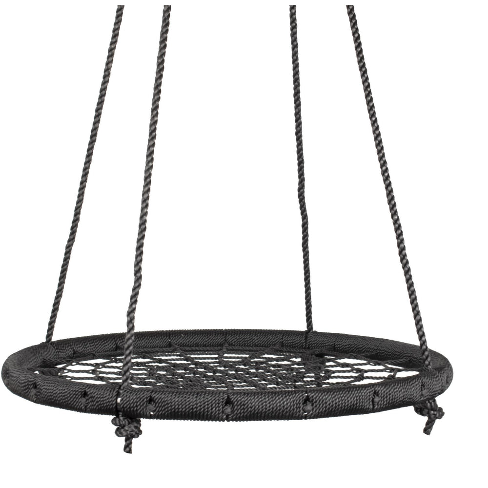 - Extra: Size: Ø100 cm Ø45 mm black lacquered steel frame Rope Type: PE Rope at the bottom: 7 mm Rope for suspension: 16 mm, 180 cm Incl. 2 rings for mounting in 8 mm chrome-plated steel CE approved Weight: 7 kg Max load 150 kg Can be used both indoors and outdoors