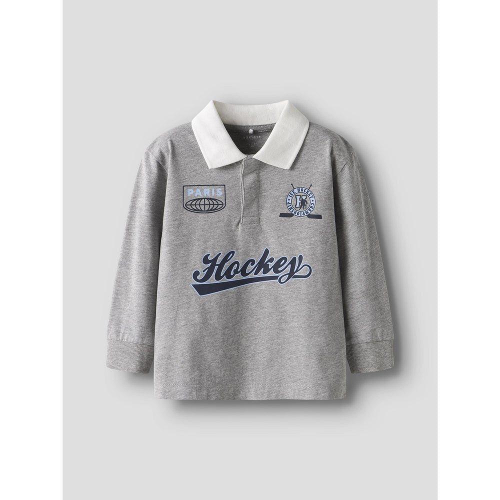Introducing the Name It Grey Melange Nmmsido Ls Nreg Polo Top, a blend of comfort and style tailored for your child's everyday adventures. Crafted from jersey, this lightweight and stretchy fabric ensures a soft feel inside and out, enhancing movement and comfort. The polo features classic long sleeves with ribbed cuffs, a neat button fastening, and is accented with a gentle rubber print. Available in regular fit, this top maintains a timeless appeal with its versatile grey melange color, making it an essential addition to your child's wardrobe. Easy to care for and perfect for any occasion, this top offers both functionality and style.