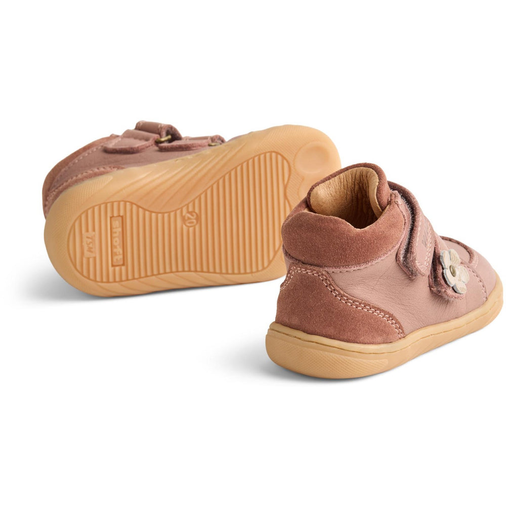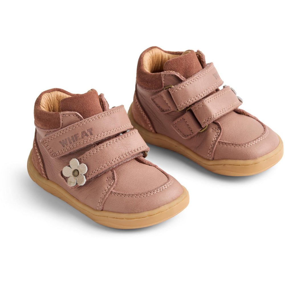Introducing the Wheat Old Rose Prewalker Barry Booties, the perfect choice for your toddler's first steps! Expertly crafted with LWG certified leather, these prewalkers feature a charming barefoot fit design, enhanced with delightful flower decorations and soothing Old Rose hues. The boots' exterior combines durable leather with soft suede accents, while the interior boasts a metal-free leather lining, ensuring optimal comfort and breathability for delicate little feet.