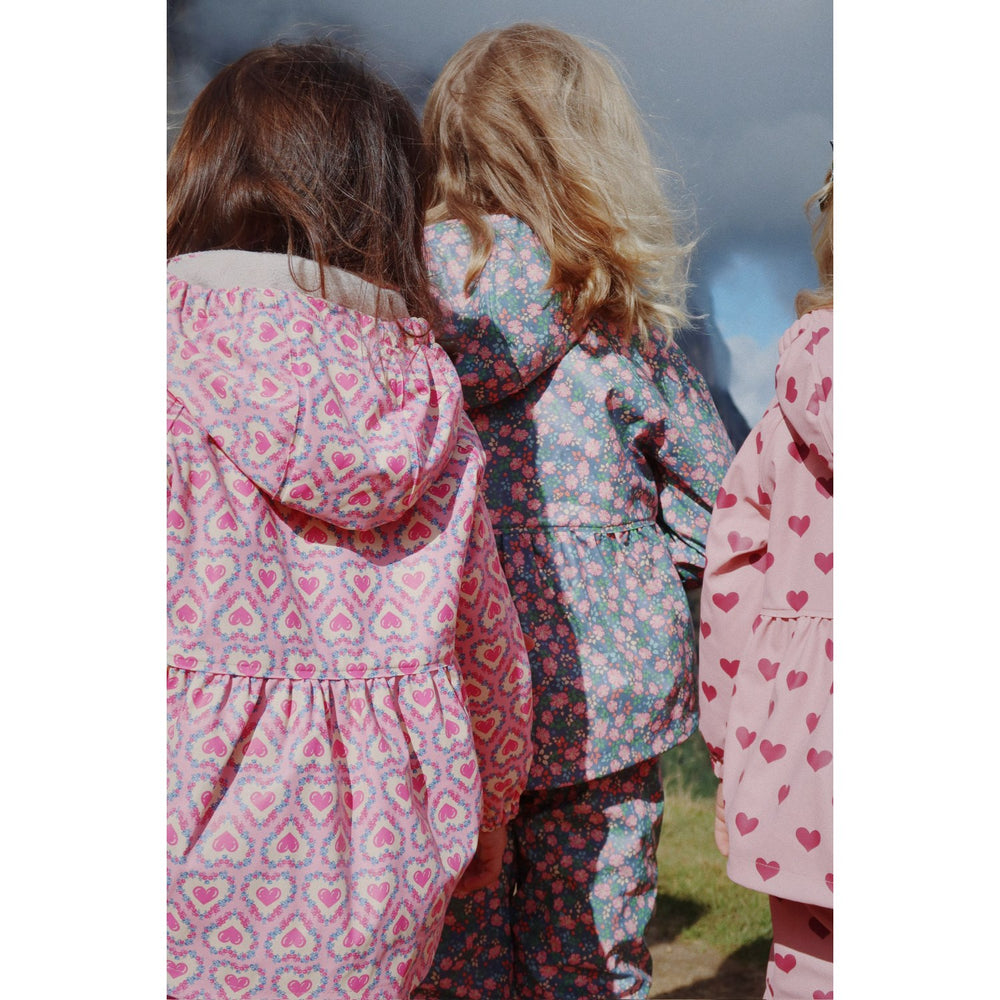 Keep your little girl cozy and dry with the Konges Sløjd Kyoto Rainy Palme Set. This charming rainwear features a waterproof and wind-resistant PU material adorned with a playful palm pattern, coupled with a warm fleece lining for added comfort. The set includes a detachable, lined hood and elastic cuffs, ensuring a snug fit and full protection in rainy weather. Welded seams enhance its durability, making it the perfect choice for your child's outdoor adventures. Easy to care for, this delightful outfit promises both style and functionality for any playful day out.