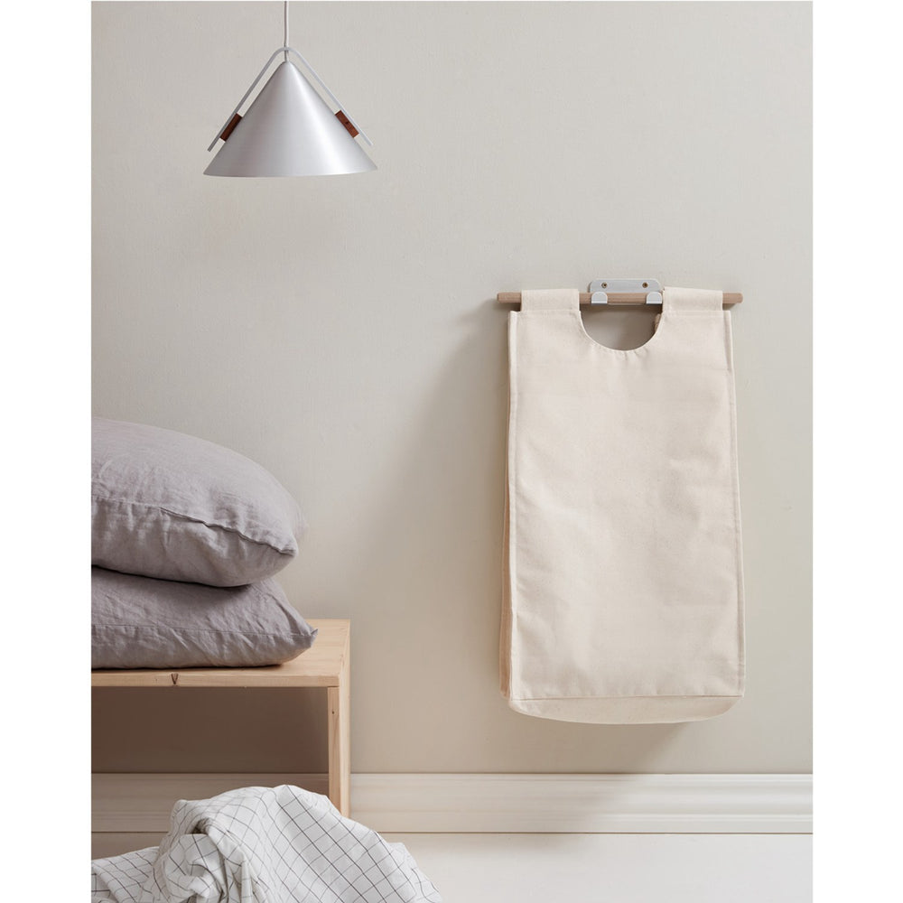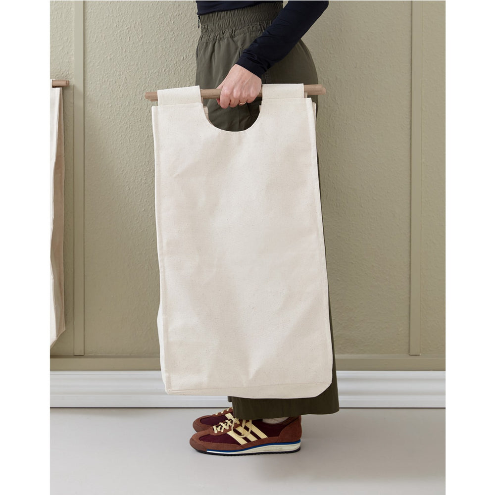 Ideal for various uses beyond laundry, such as storing toys or recycling, this versatile organizer fits seamlessly into spaces like kitchens, bathrooms, or children’s rooms, combining beauty with practicality. It is effortless to maintain; simply wash the bag at 30 degrees on a gentle cycle. Elevate your home’s organization and style with this Danish-designed storage solution—effortless, elegant, and environmentally conscious. Materials: 100% Cotton, PE coating, oak round sticks, and painted metal hook Measurements: L24.5 x W35 x H57 Washing instructions: The textile bag can be washed at 30 degrees on a gentle cycle Certifications: GOTS-certified textile