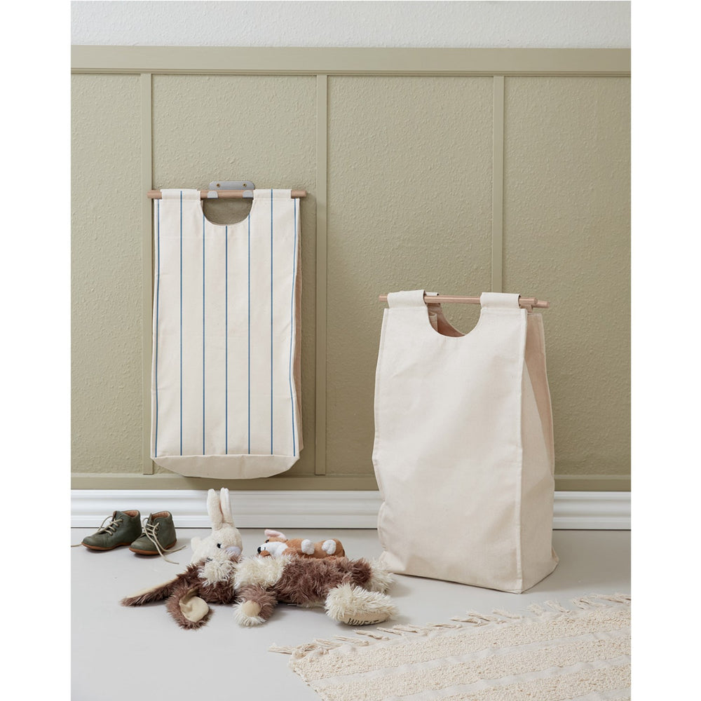 Spanning 35 cm in width, 57 cm in height, and 24.6 cm in depth, this lightweight bag (0.5kg) simplifies maintenance with its washable fabric at 30 degrees on a gentle cycle. Add a touch of Danish elegance and practicality to your child’s space, whether for sorting laundry or storing those beloved toys, enhancing both comfort and room organization. Materials: 100% Cotton, PE coating, oak round sticks, and painted metal hook Measurements: L24.5 x W35 x H57 Washing instructions: The textile bag can be washed at 30 degrees on a gentle cycle Certifications: GOTS-certified textile