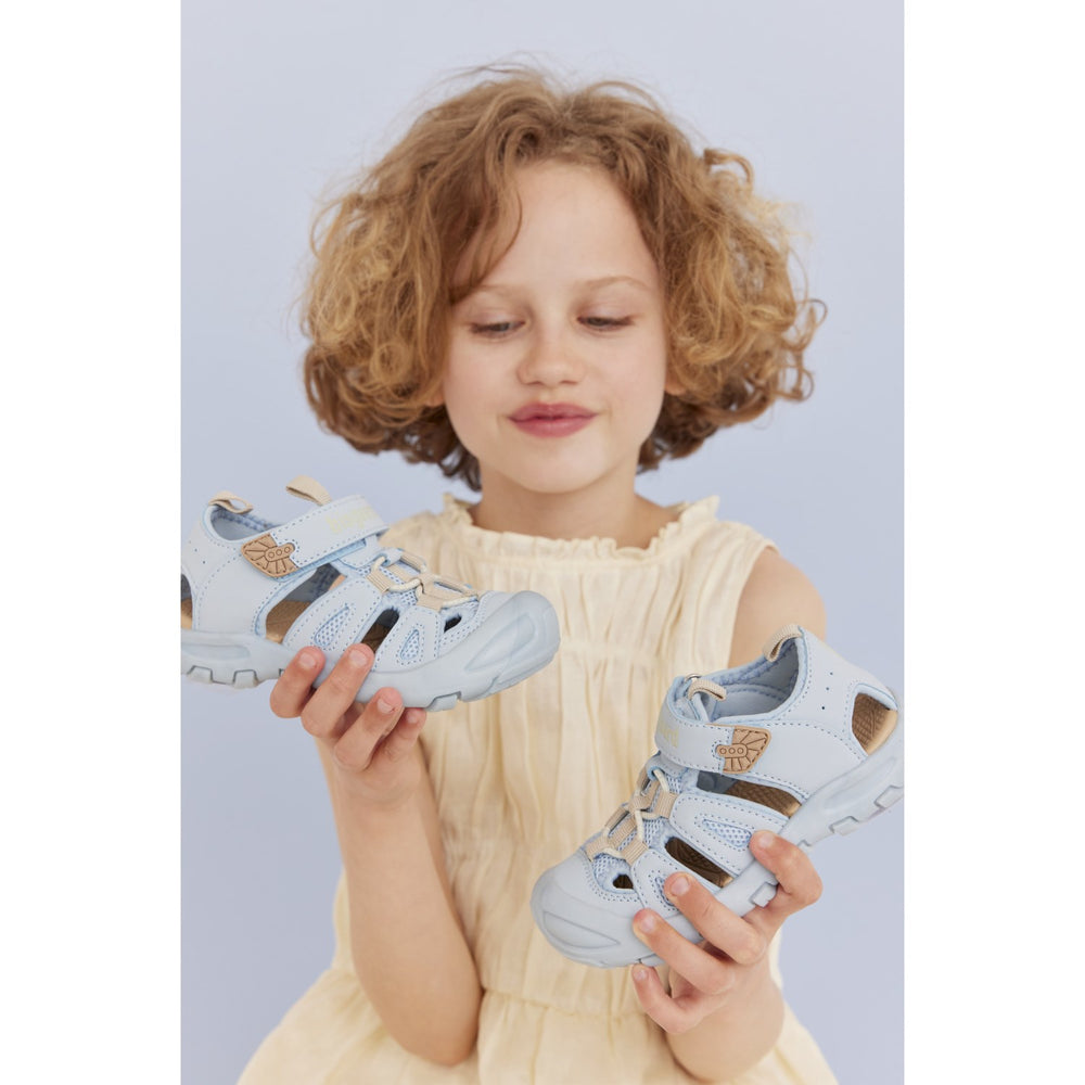 Introducing the 'Parker' Velcro shoe by Bisgaard, the ideal choice for your little one's summertime adventures. Crafted from a breathable textile upper and soft neoprene lining, these baby blue sandals ensure all-day freshness and comfort. Key features include a flexible, non-slip outer sole that complements the natural movement of tiny feet and an EVA insole for superior shock absorption. The combination of elastic laces and a Velcro closure provides a snug fit while making it easy for quick on and off. Added full toe protection means playtime is both fun and safe. Perfect for any active child ready to explore the world, these sandals are designed to endure, offering both style and durability.