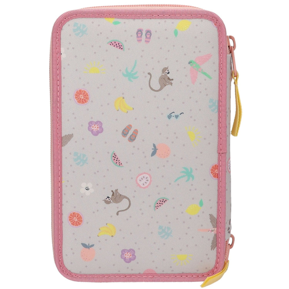 Discover the delightfully vibrant TOPModel Juicy Triple Pencil Case, designed to ignite your child's creativity and organize their school supplies in style. This pencil case features a unique double model motif showcased alongside a playful little monkey, set against a lively background adorned with dots, flowers, fruit, birds, monkeys, palm trees, and summer accessories. The pastel apricot sides, pink sewn edges, and cheerful yellow textile zip pullers add a touch of whimsy and are specifically crafted for easy handling by little hands.