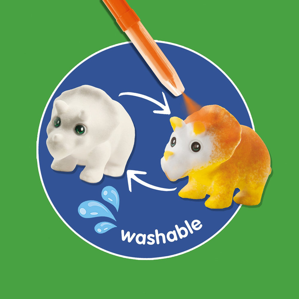 - Contents: 3 x dinosaurs, 4 x puffing markers (turquoise, yellow, orange, purple), 1 x sponge