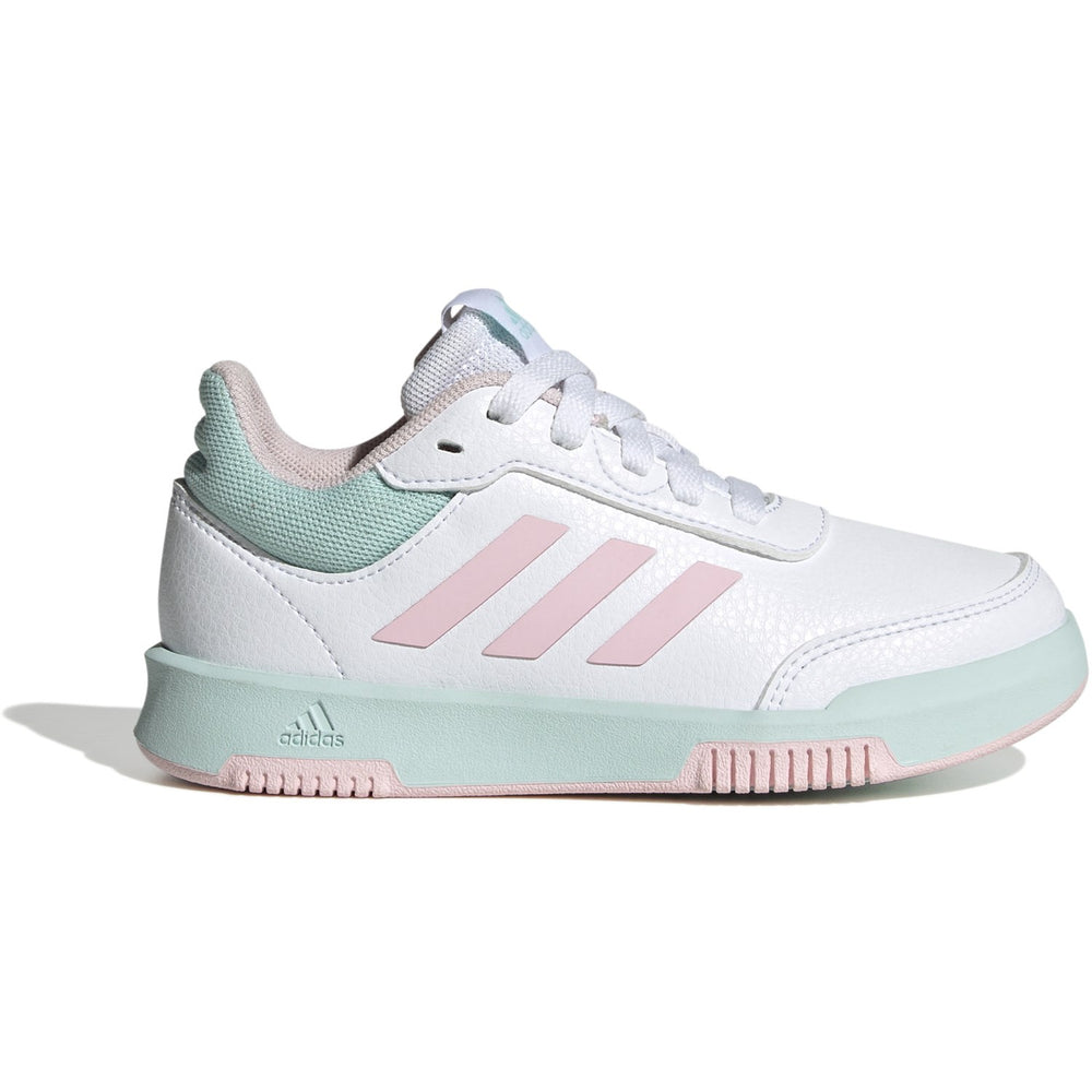 Introduce your little one's feet to the delightful blend of style and sustainability with the adidas Originals Tensaur Sport 2.0 K Sneakers in Ftwr White, Clear Pink, and Semi Flash Aqua. Crafted from at least 50% recycled materials, these sneakers are as gentle on the planet as they are on your child's feet. Featuring a non-marking rubber outsole, they're perfect for both classroom and playground antics. Their vibrant color palette and sleek design ensure your child steps out in style, while their comfort-fitting build supports growing feet during all their adventures. Opt for these eco-friendly and stylish sneakers to encourage both playtime and environmental mindfulness.