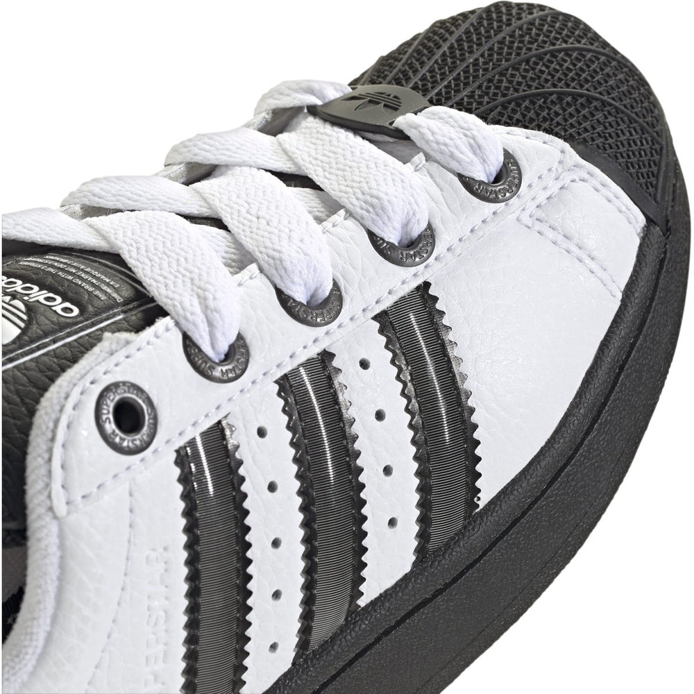 - Extra: Serrated 3-stripes, Superstar box logo on the tongue, Trefoil logo on the heel tab.
