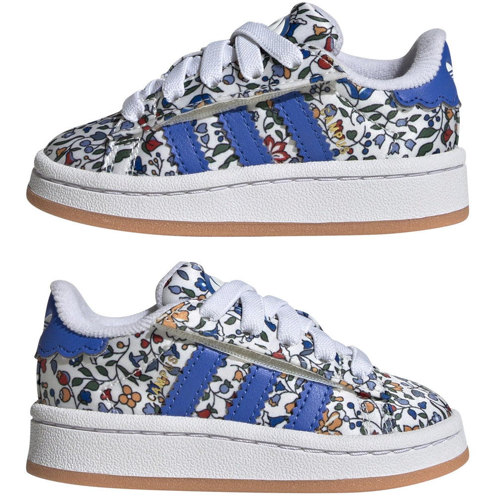 Introduce your little one to the vibrant world of fashion with adidas Originals Campus 00S Cf El I Sneakers for infants. These charming sneakers feature a striking collaboration with Liberty London, boasting an artistic floral pattern in Supplier Colour/Blue/Off White that reflects timeless British craftsmanship. Designed with convenience in mind, they come equipped with hook-and-loop straps for effortless fitting, while the soft textile lining ensures your child's feet stay comfortable and snug. Perfect for toddlers taking their first steps or active little explorers, these sneakers combine style, comfort, and ease of wear, making them an ideal choice for everyday adventures. Fit: Regular Materials: Upper: Synthetic, Textile, Lining: Textile, Sole: Rubber Extra: Campus-specific Y2K branding on tongue, Trefoil branding on heel tab, Campus wording on lateral side, serrated three stripes. Liberty London and Adidas Trefoil branding on the sockliner.