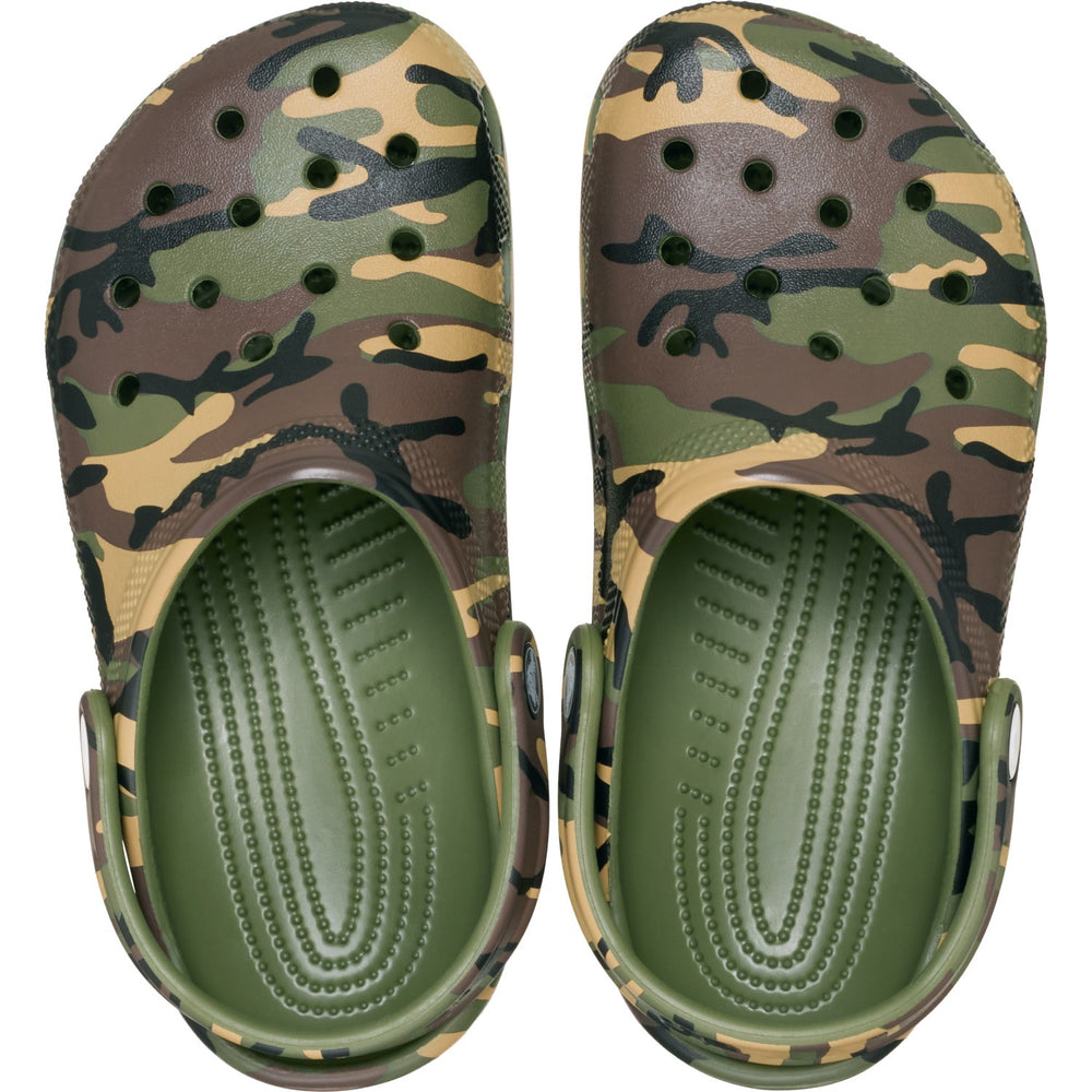 Introducing the Crocs Army Green/Multi Classic Camouflage Clog — a perfect blend of fun and functionality for your little one's feet. Crafted from lightweight, durable material, these sandals feature a stylish camouflage pattern in army green. The roomy fit and pivoting heel strap ensure easy slip-on comfort while offering secure wear. Ideal for both indoors and outdoors, they're easy to clean and maintain, making them a practical choice for children's daily adventures.