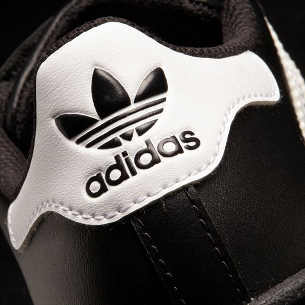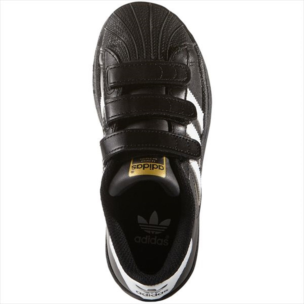 adidas classic superstar sneakers. These in a classic black leather with white stripes. The shoe closes with Velcro straps, which makes it easy to get them on and off.