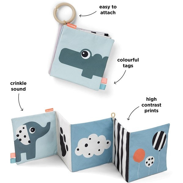Contrasting black and white colours supports visual stimulation for the newborn and more colourful fun-filled pages for the older baby