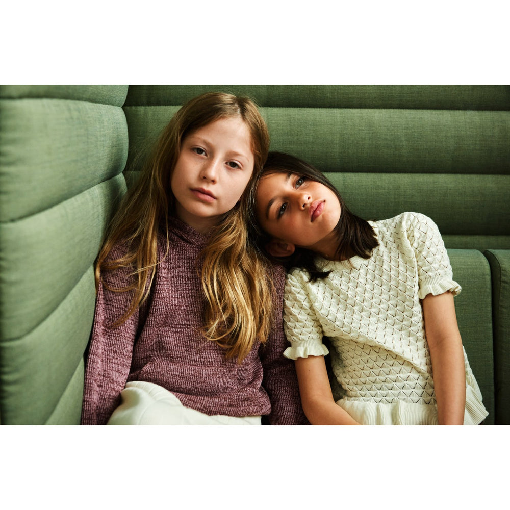 The tee offers a comfortably straight fit and is adorned with a delicate pointelle knit pattern that adds a hint of sophistication. The round neckline with rib trim ensures easy dressing and a snug fit. Designed for versatility and wearability, this tee is ideal for daily wear or special occasions, making it a perfect addition to any child’s wardrobe.