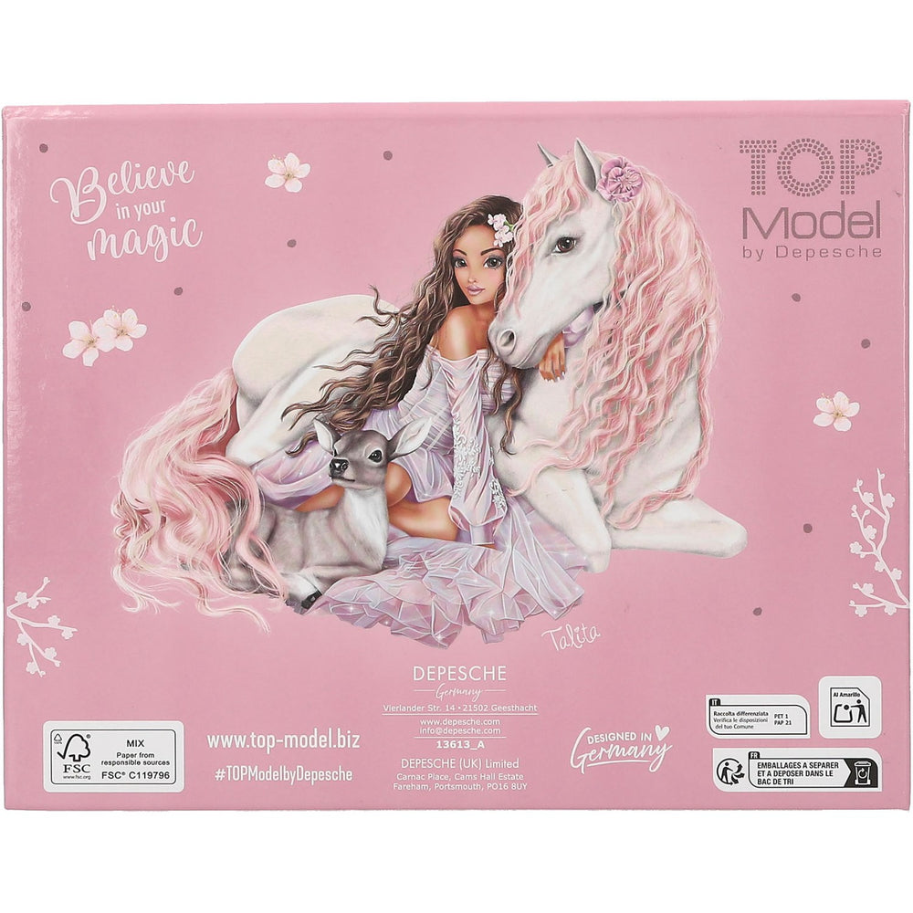 Discover the charm of organization with the TOPModel Viva Violet Stationery Box, designed to inspire creativity and order. This delightful set includes three vibrantly colored pencils adorned with model motifs, a whimsical eraser featuring a horse print, and 100 beautifully illustrated notepads for capturing thoughts and dreams. Also, it comes with 25 pink paper clips for keeping documents tidy. Encased in a soft pink box with an enchanting model motif, including a horse, delicate flowers, trees, and a castle, it’s not just functional but a decorative piece as well. The inclusion of a mirror inside the hinged lid adds an extra touch of magic, making it an ideal choice for young learners to store and transport their stationery essentials securely. Perfect for children who enjoy artistic expression and parents who value educational and practical gifts.