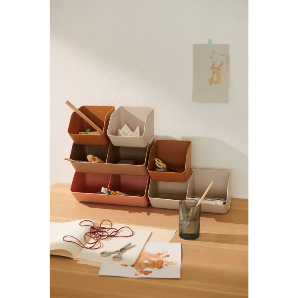 LieWood Sandy Rosemary Desktop Organizer S 2-Pack – the perfect solution to keep your child's workspace neat and stylish. This pair of stackable storage boxes is designed to conveniently organize everything from little treasures like pearls to essential desktop accessories and tiny building blocks. Crafted to fit neatly either on a desk, mounted on a wall, or tucked inside a cabinet, the Rosemary organizer boasts a versatile design that supports a variety of storage needs. Each box measures a compact 11.9 cm in height, 13.9 cm in length, and 18.2 cm in width, offering ample space without taking up too much room. Functionality meets aesthetics with the Rosemary desktop organizer. Its ability to stack or be individually displayed allows you to customize your or your child’s storage setup as needs grow and change. The subtle, charming aesthetics ensure that it adds a touch of sophistication to any room. Whether for organizing craft supplies, school essentials, or small toys, the LieWood Sandy Rosemary Desktop Organizer makes maintaining tidiness effortless, fostering a better learning and playing environment for your kids.