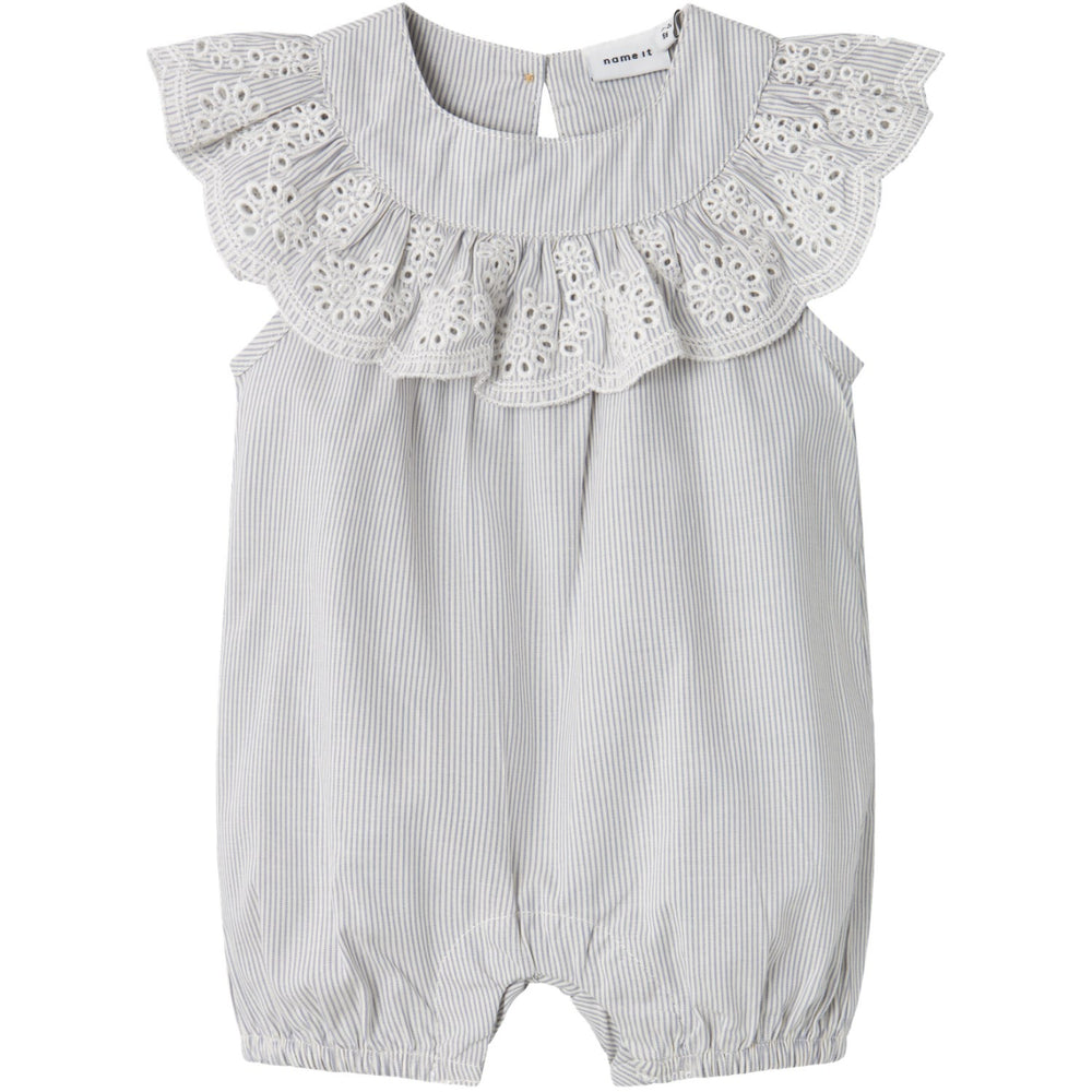 Dress your little one in the Name It Chambray Blue Hiline Sunsuit, an epitome of style and comfort for the summer. This 100% cotton romper features a classic woven design with a unique criss-cross texture, adorned with delicate lace details. The easy button and loop fastening, along with press stud closures in the crotch for sizes up to 86, ensures quick changes. Its elasticated hems and regular fit offer great wearability, perfect for both active play and relaxation on warmer days. Ideal for creating memorable summer experiences, this charming outfit combines durability with a soft, breathable feel, keeping your child cool and comfortable while exploring the sunny outdoors.