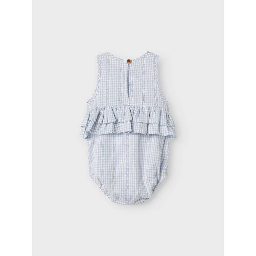 Dress your little one in the Lil'Atelier Zen Blue Nbfhazelle Sl Suit, a summer romper that merges style with comfort. This sleeveless bodysuit is crafted from woven fabric with a classic criss-cross pattern and a textured surface, ensuring a sharp look. The round neck and easy press stud fastening make it wearable and secure. Adorned with charming frills and available in serene blue, it's perfect for both daily wear and special occasions. Remember, keep this adorable outfit away from fire for safe use. Ideal for infants who love to stay both comfortable and stylish!