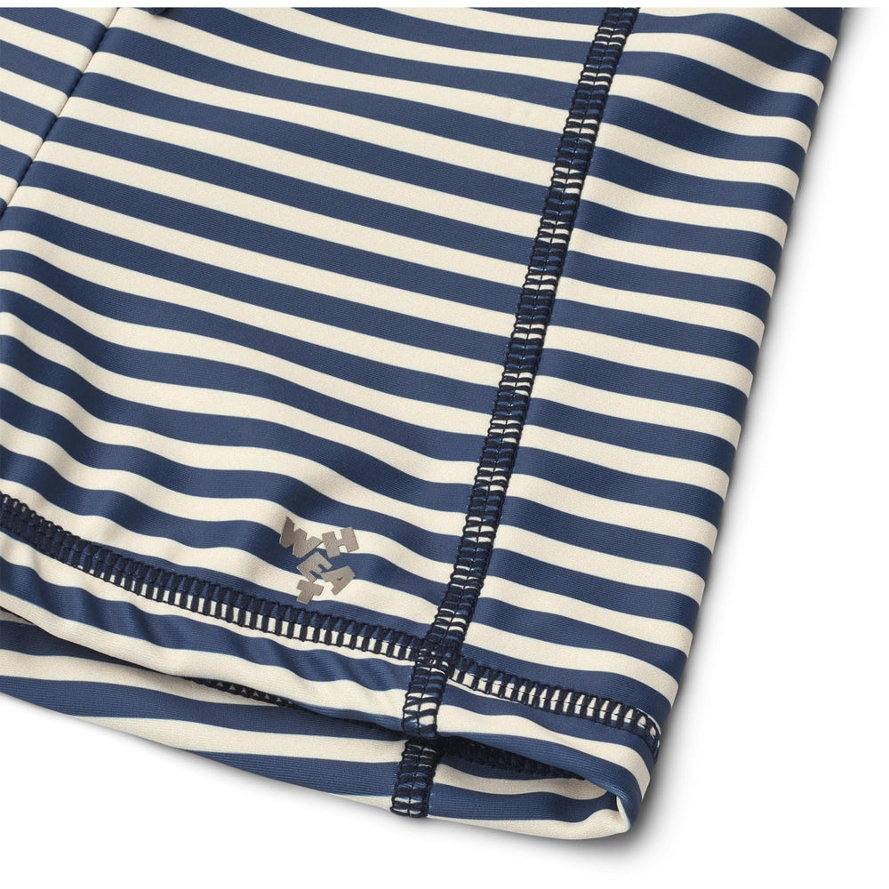 Make a splash with the Wheat Blue Stripe Swim Shorts Ulrik! These trendy swim shorts promise both style and comfort with a casual fit and integrated lining. Crafted from 83% recycled polyester, these shorts not only feel good but also do good. Featuring elastic and a drawstring at the hip for the perfect fit, they're ideal for every young swimmer. Plus, they offer UV 40+/UPF 40+ protection and boast OEKO-TEX® certification, ensuring they meet high safety and environmental standards. Mix and match with a swim T-shirt for a fun day in the sun!