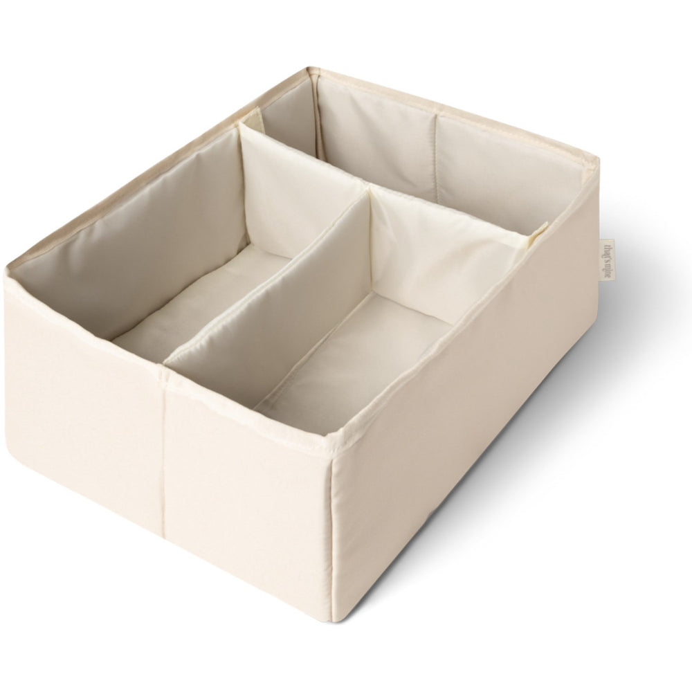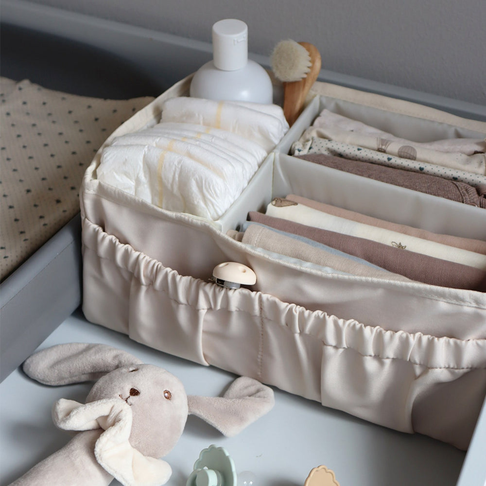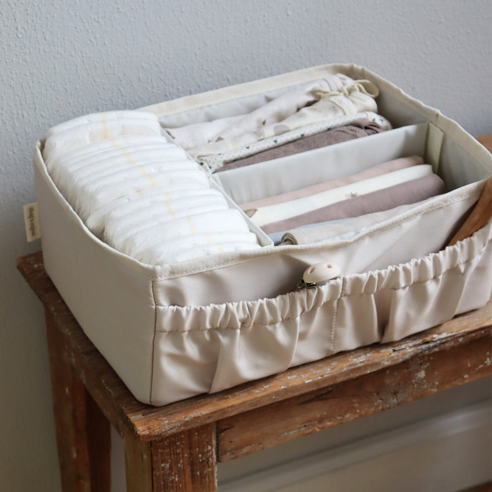 Discover the ultimate solution for organized diaper changes with our Peyote Lily Nursing Organizer. This versatile storage box is designed to hold all your changing necessities from diapers to creams, and it features a large compartment with customizable dividers secured by a practical Velcro closure. Choose between one spacious area or three separate sections to suit your needs. Additionally, the box includes one large and two smaller pockets for extra storage. Enjoy easy cleanup and space-saving convenience as the box folds up flat when not in use, making it perfect for any children's room.