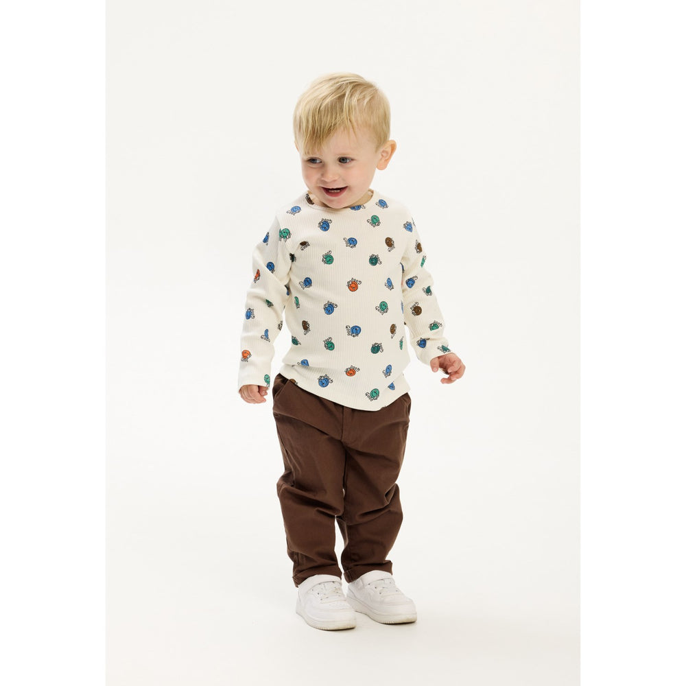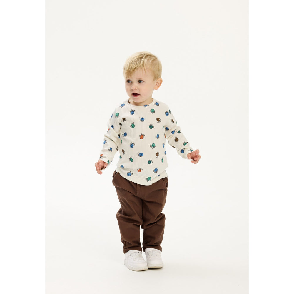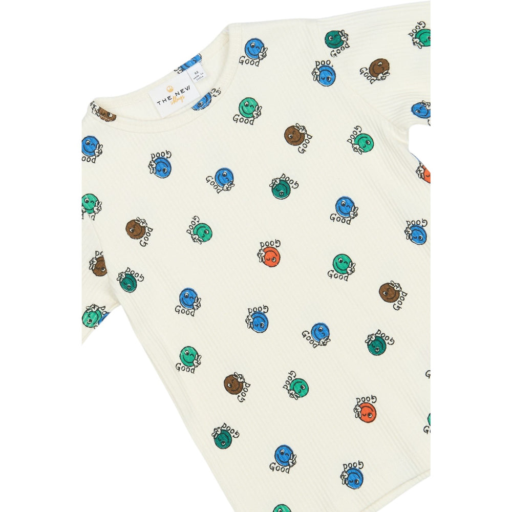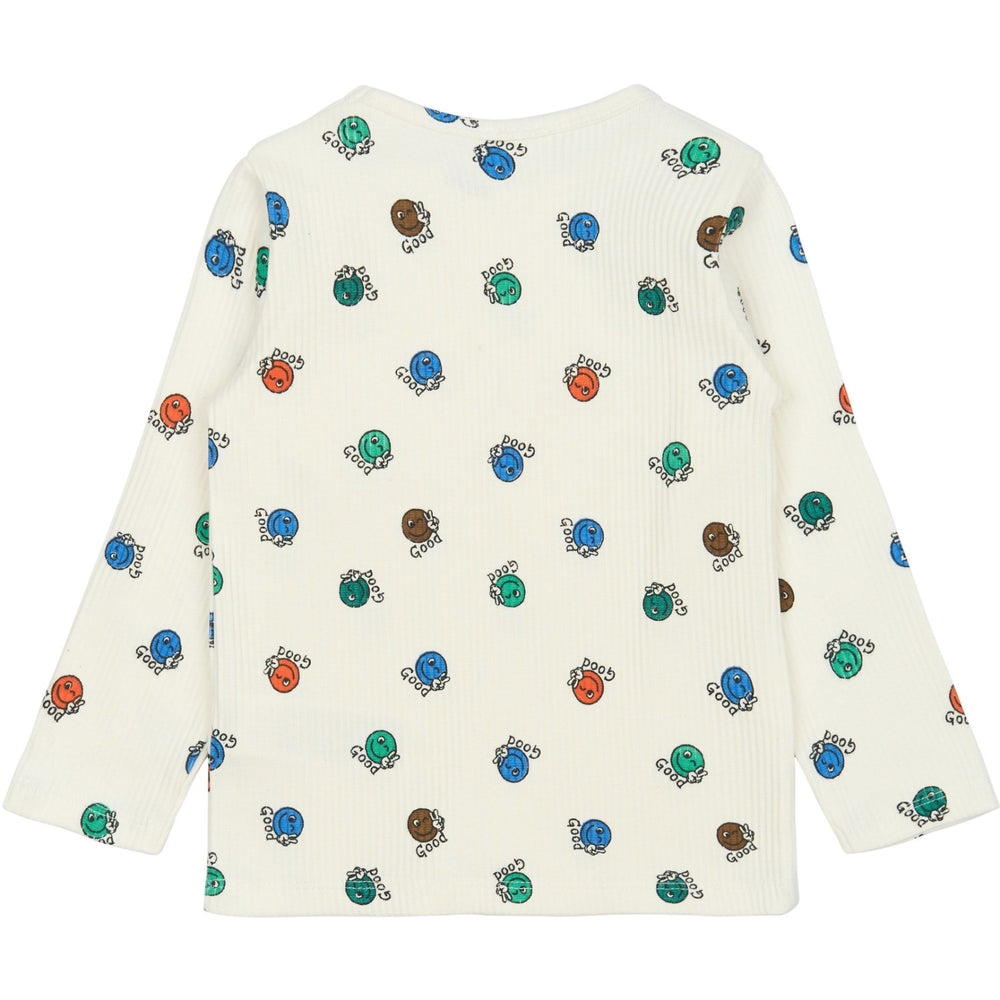 Discover the charming THE NEW Siblings Cloud Dancer AOP Palmer L_S Rib Tee, expertly designed for stylish little ones! Crafted from GOTS-certified organic rib knit fabric, this tee promises both sustainability and comfort. It features a playful all-over print of smiling faces and the uplifting phrase "Good," perfect for spreading positivity. Its regular fit, long sleeves, and round neckline ensure a cozy fit for all-day wear. The handy press stud closure at the collarbone adds a functional touch, making dressing easier. Versatile and trendy, this tee pairs seamlessly with matching TNSTPalmer rib leggings to create a complete and fashionable outfit for any occasion.