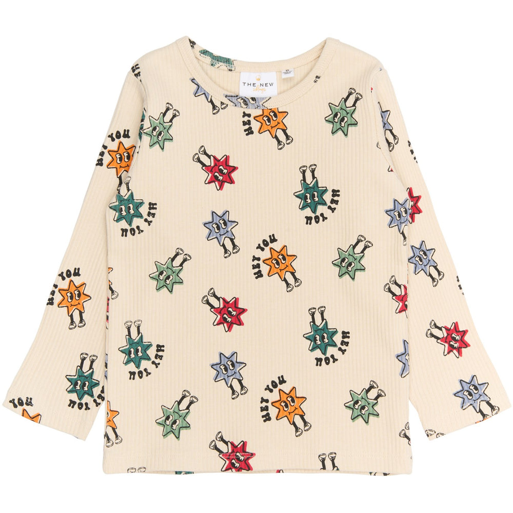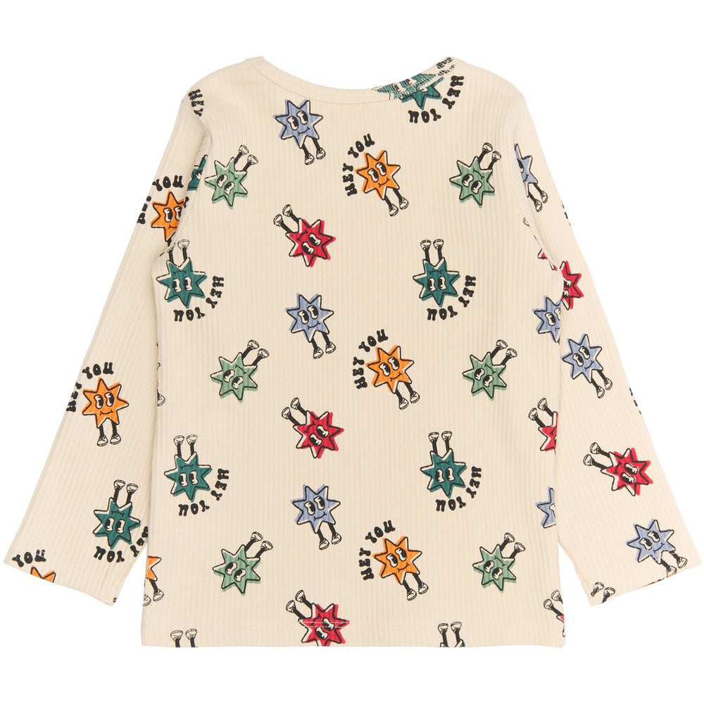 Discover the delightful Gardenia AOP Raul L_S Rib Tee from THE NEW Siblings, perfect for your little ones' adventurous days. Crafted from GOTS Organic-certified, soft, and stretchy ribbed fabric, this blouse ensures all-day comfort. Featuring a charming all-over print of tiny star characters alongside the playful phrase "Hey you," it brings a splash of fun to any outfit. Designed with a snug fit and a classic round neckline, this rib tee is ideal for everyday wear or layering during cooler weather. Its eye-catching design and organic materials make it a stylish and sustainable choice for children's casual wear.