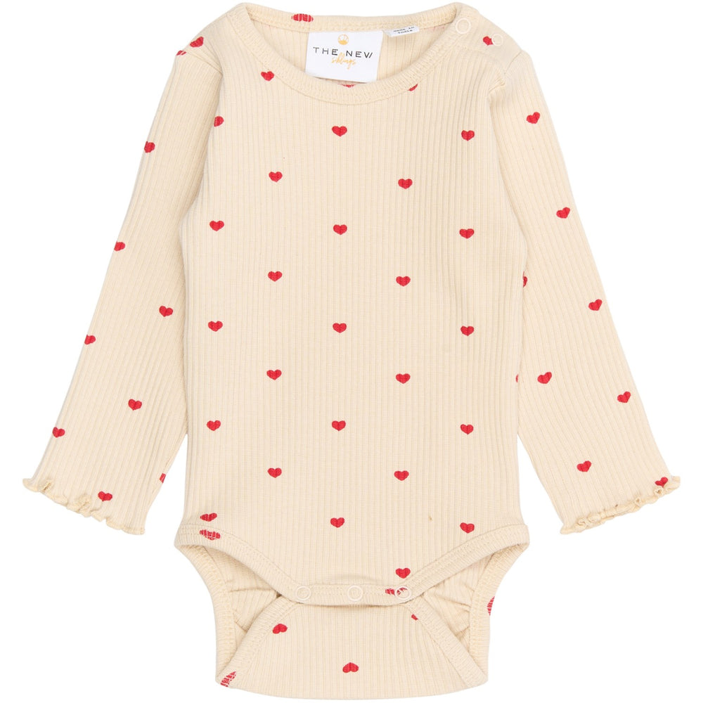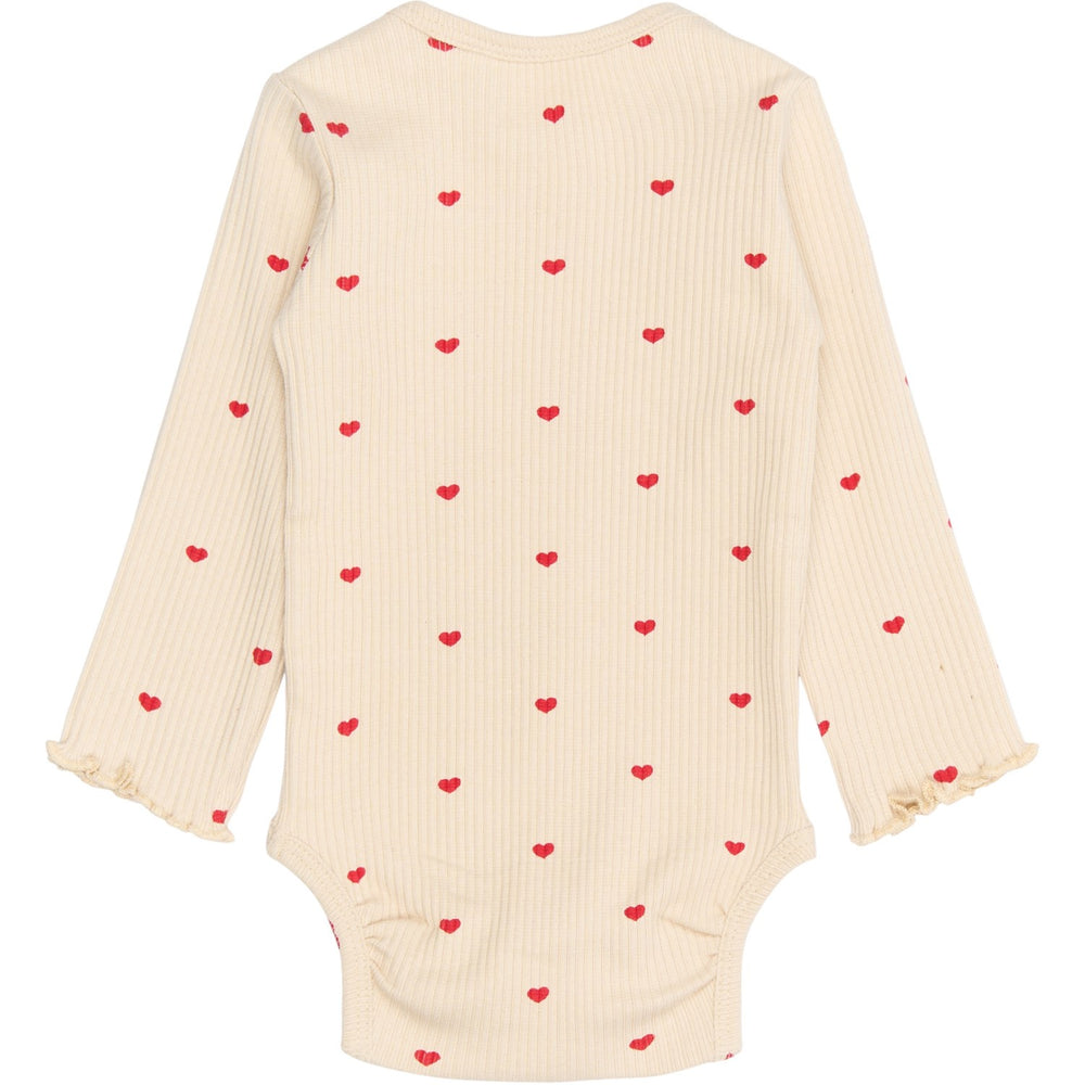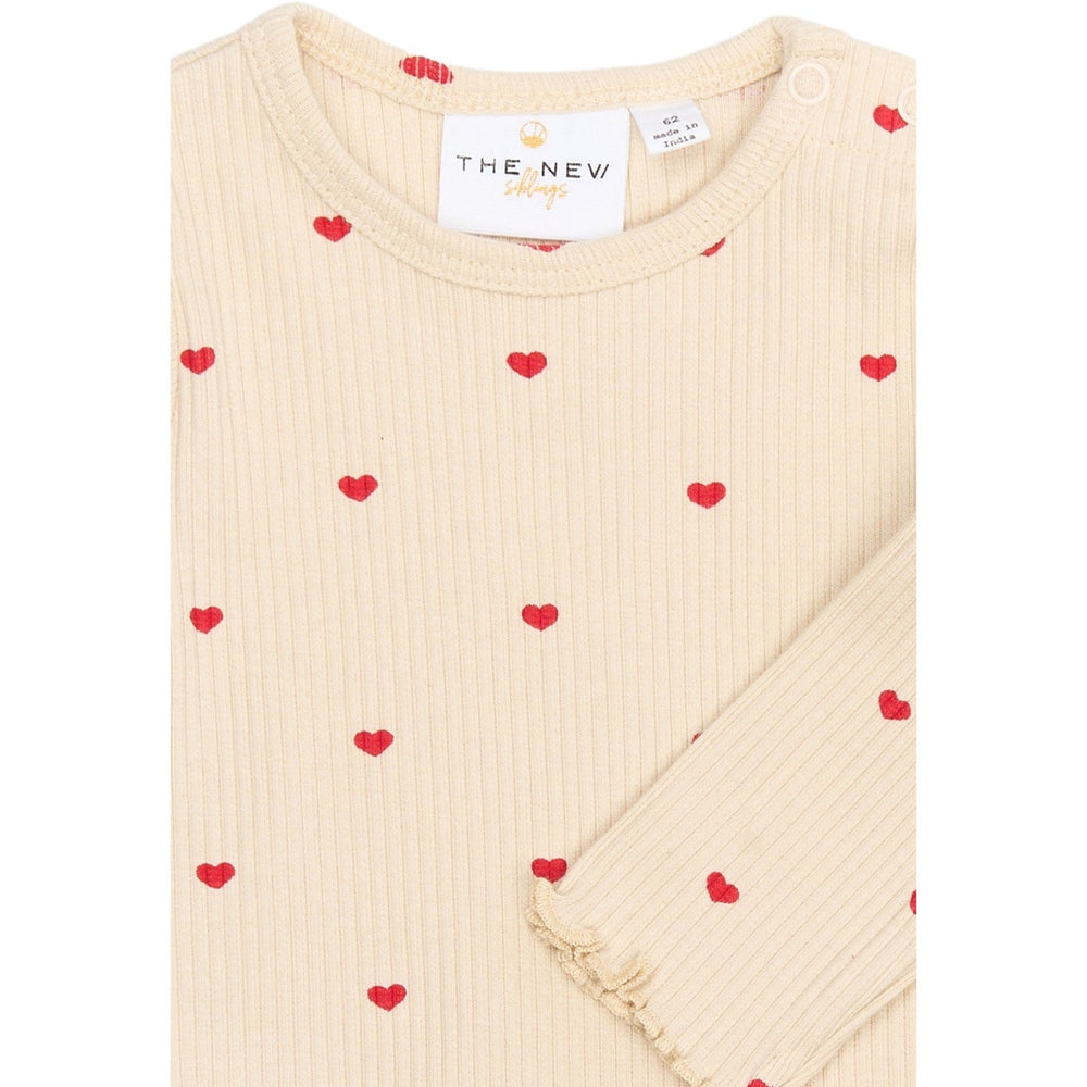 Introduce your little one to the delightful comfort of THE NEW Siblings Gardenia AOP Rhea L_S Rib Body! Designed to be as charming as it is comfortable, this long-sleeved bodysuit showcases an all-over heart print accented with elegant frilled sleeve edges that add a touch of whimsy. Crafted in a slim fit, it offers both style and practicality merged effortlessly.