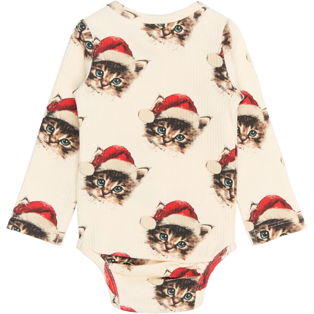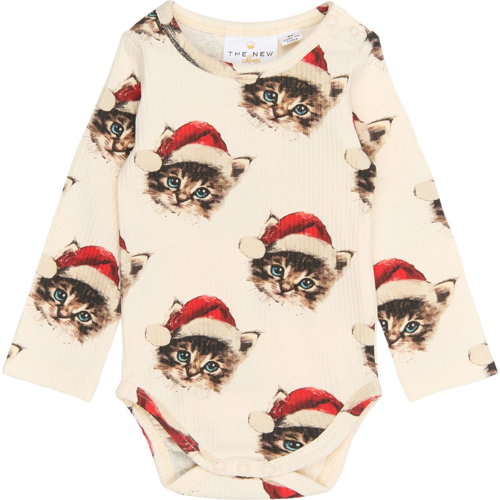 Delight in the festive charm of THE NEW Siblings Gardenia Cat AOP Holiday L_S Rib Body, perfect for the holiday season. Crafted from GOTS-certified organic material, this bodysuit ensures a soft touch and comfort for your little one. Available in two playful styles—Santa cat and holiday dinosaurs—it features vibrant all-over prints injecting joy into cozy moments. The slim fit and handy snap buttons at the shoulders and bottom offer ease in dressing, ideal for daily wear during the winter festivities. Whether lounging at home or celebrating, this bodysuit combines comfort with adorable holiday spirit. Materials: 95% Cotton Organic, 5% Elastane Certifications: GOTS