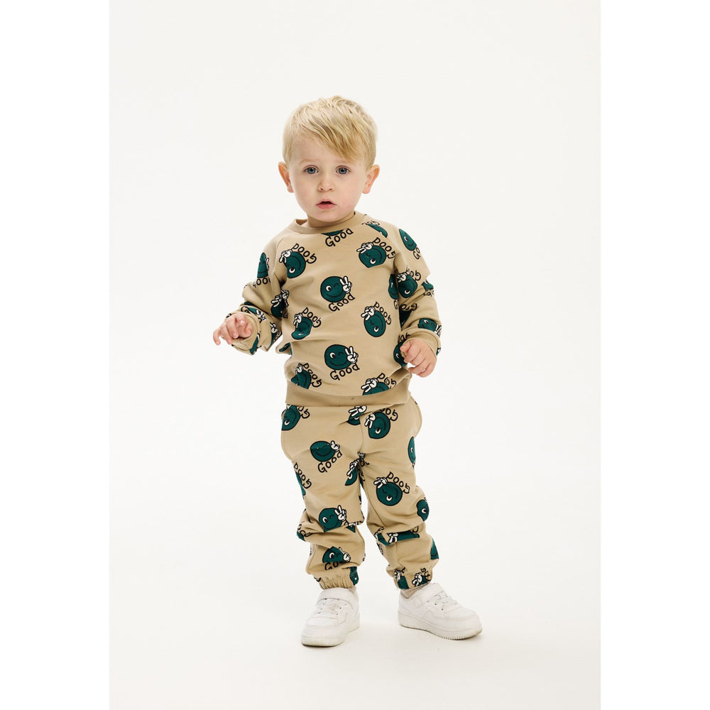 Dress your little one in the cozy charm of THE NEW Siblings Humus AOP Phil Sweatpants, perfectly blending style and comfort. Crafted from soft, GOTS Organic certified fabric, these sweatpants ensure a gentle touch against sensitive skin. The regular fit, coupled with an elastic waistband and cuffs, provides a snug fit while allowing for ample movement during play or relaxation. Featuring a whimsical all-over print of a winking smiley face and the playful text "Good," these pants bring a splash of fun to your child's wardrobe. Complete with side pockets for small treasures, these sweatpants are ideal for both active playdates and quiet days at home. Coordinate with the TNSTPhil sweatshirt for an adorable ensemble that's great for a range of occasions.
