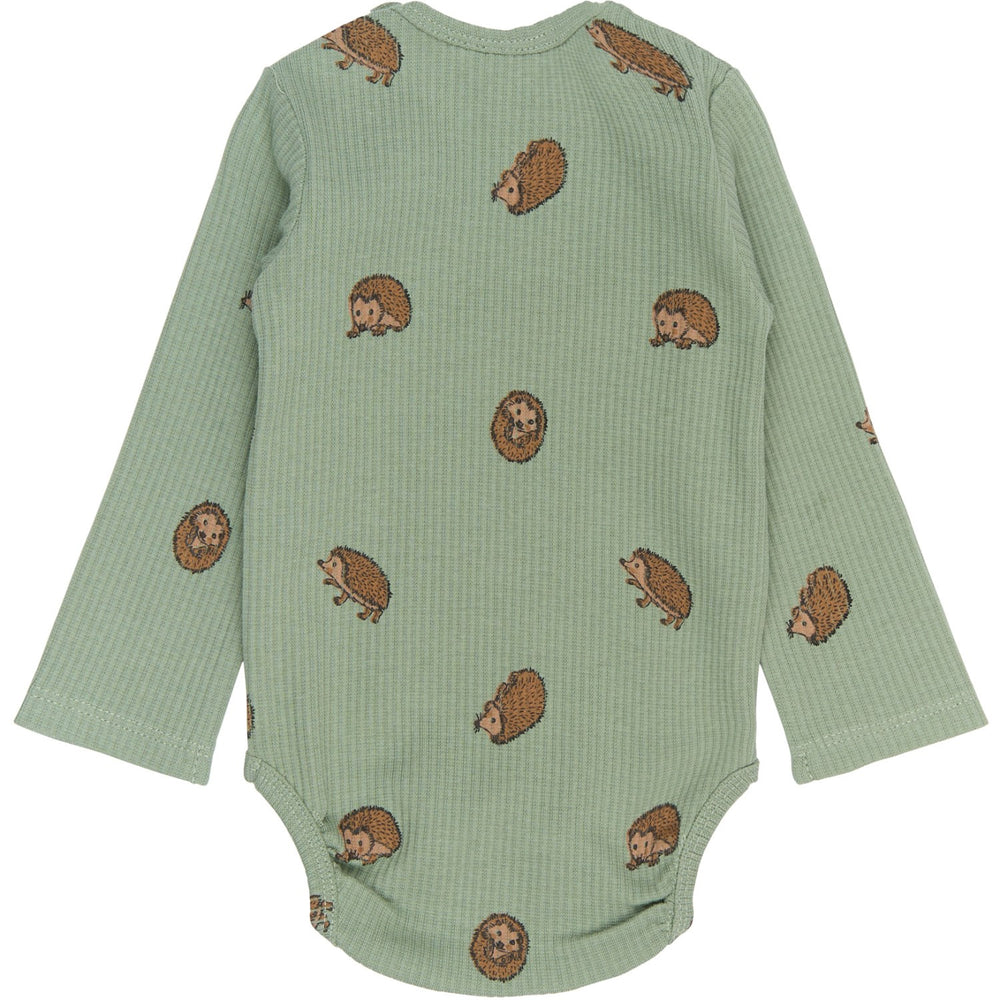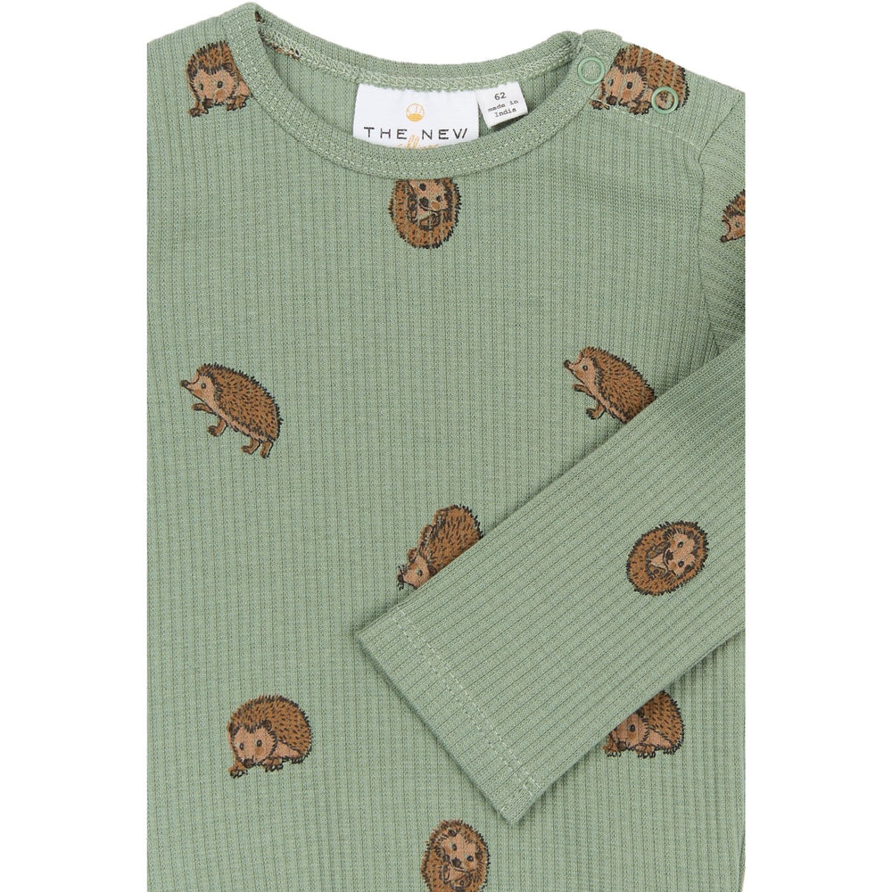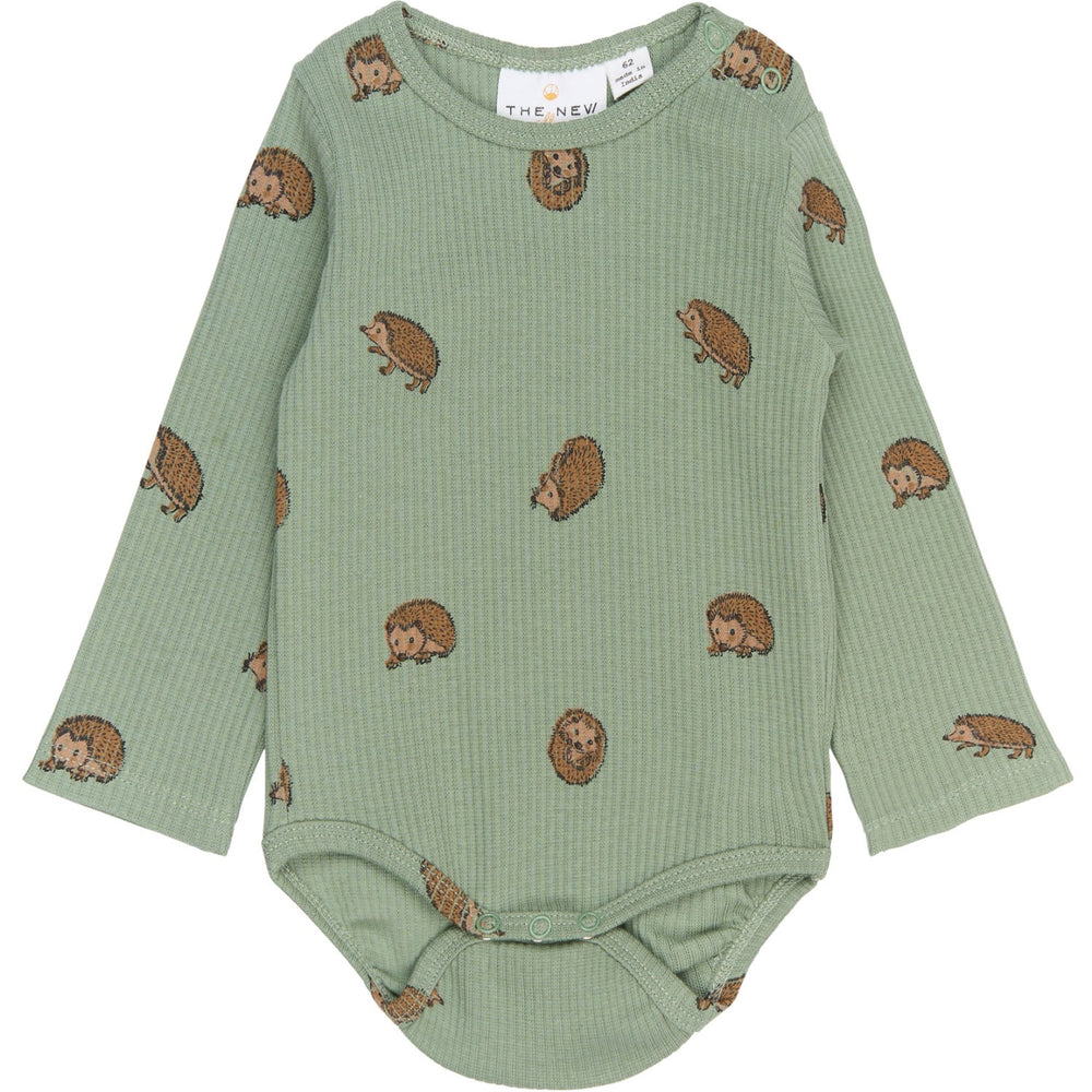 Introducing the delightful THE NEW Siblings Lily Pad AOP River L_S Rib Body, a cozy staple for your little one's wardrobe. Tailored with a slim fit, this long-sleeved bodysuit boasts a playful all-over hedgehog print, adding a touch of whimsy to your child's outfits. Crafted from GOTS-certified organic fabric, it ensures your baby's comfort and safety, making it soft to the touch and ideal for sensitive skin.