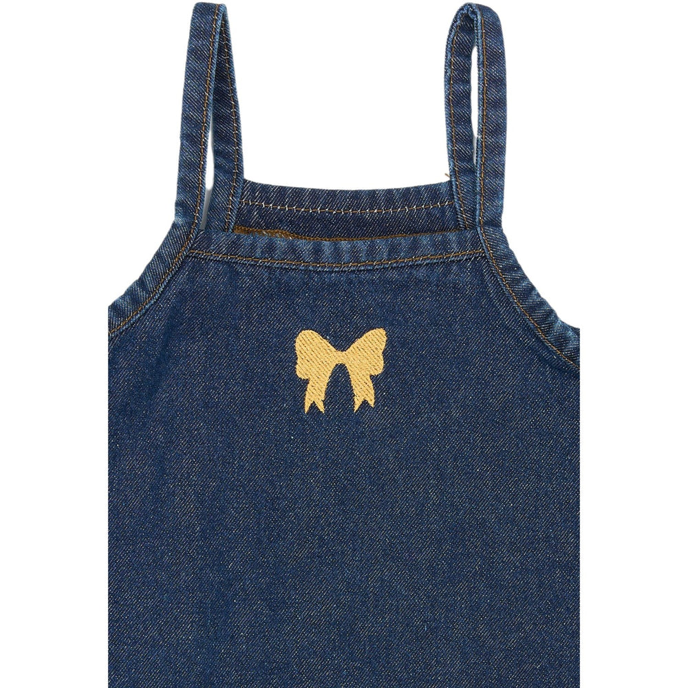 Dress your little one in the charming Medium Blue Denim Raya Strap Dress from THE NEW Siblings, perfect for both fun-filled days and casual outings. Crafted from cozy soft denim, this dress is comfortable and easy to wear, ensuring your child stays happy during any activity. The design features narrow shoulder straps and a delightful ruffled hem that adds a splash of playfulness, while a small butterfly embroidery on the chest injects a dose of femininity. Its versatile hue and relaxed fit make it an excellent choice for warm-weather adventures. Whether it's a day at the park or a family gathering, this dress combines style, comfort, and practicality for all occasions.