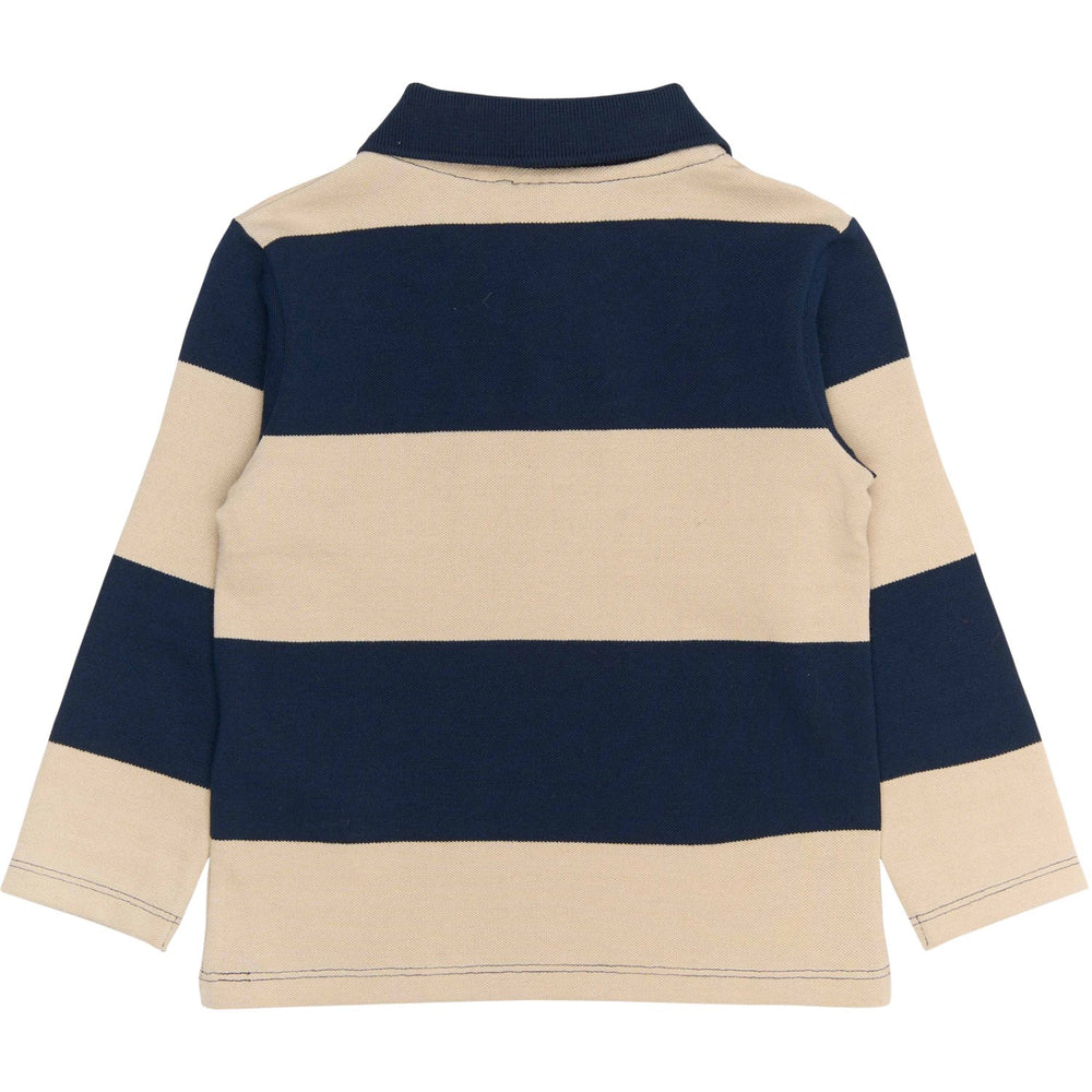 Dress your little one in the timeless elegance of the Navy Blazer Striped Rinon L_S Pique Polo from THE NEW Siblings. This charming long-sleeved polo shirt mingles sporty flair with classic style, featuring wide horizontal stripes and a neat polo collar with button details. Its soft cotton blend ensures comfort, making it ideal for both playful afternoons and special occasions alike.
