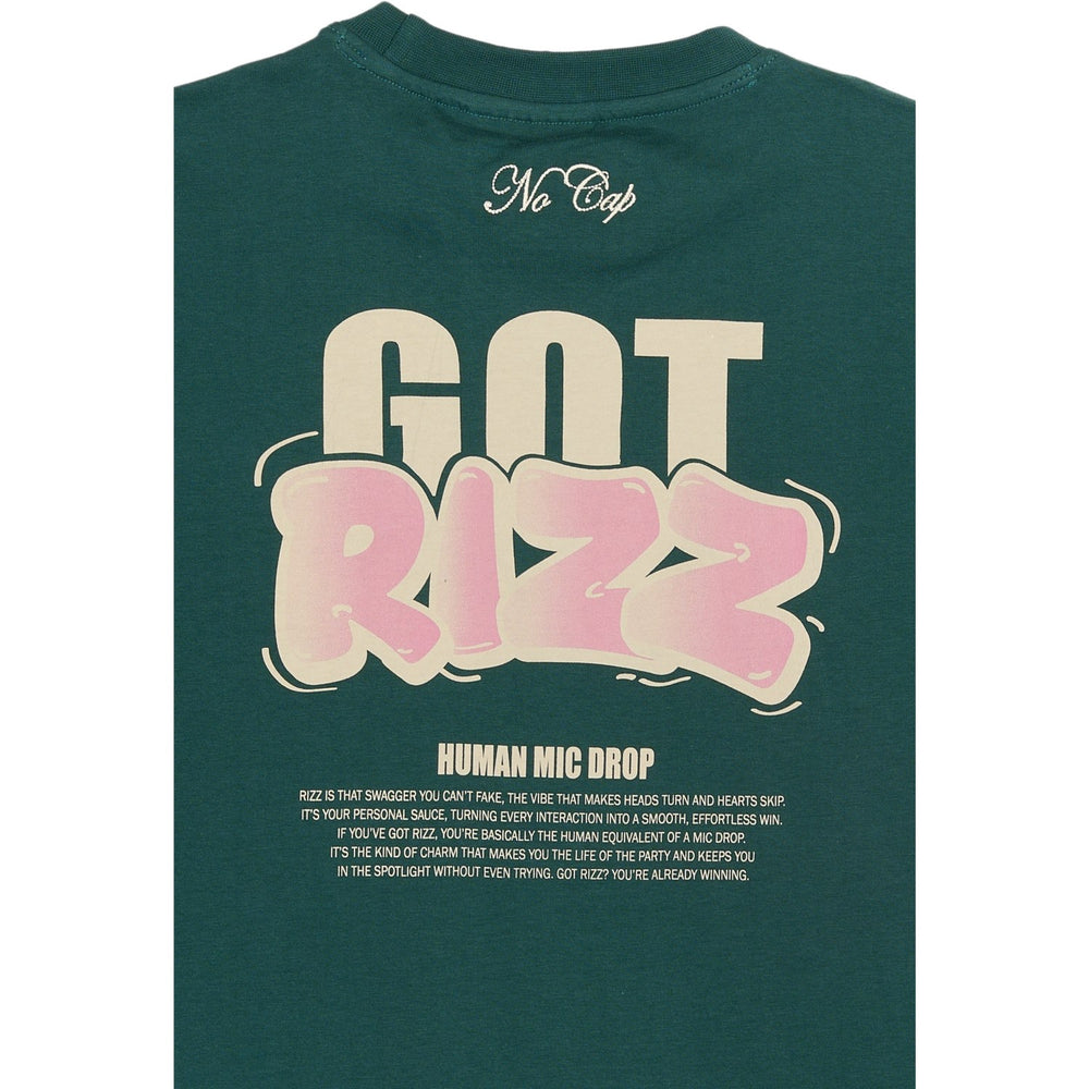 Discover the charm of stylish comfort with the New Deep Teal Regan Oversize S/S Tee from THE NEW. Perfect for children who love to sport a laid-back yet vibrant look, this T-shirt showcases a unique deep teal shade complemented by enticing front and back graphics, including the playful "GOT RIZZ" text. Crafted with care from GOTS certified organic materials, it promises softness, durability, and responsible fashion.