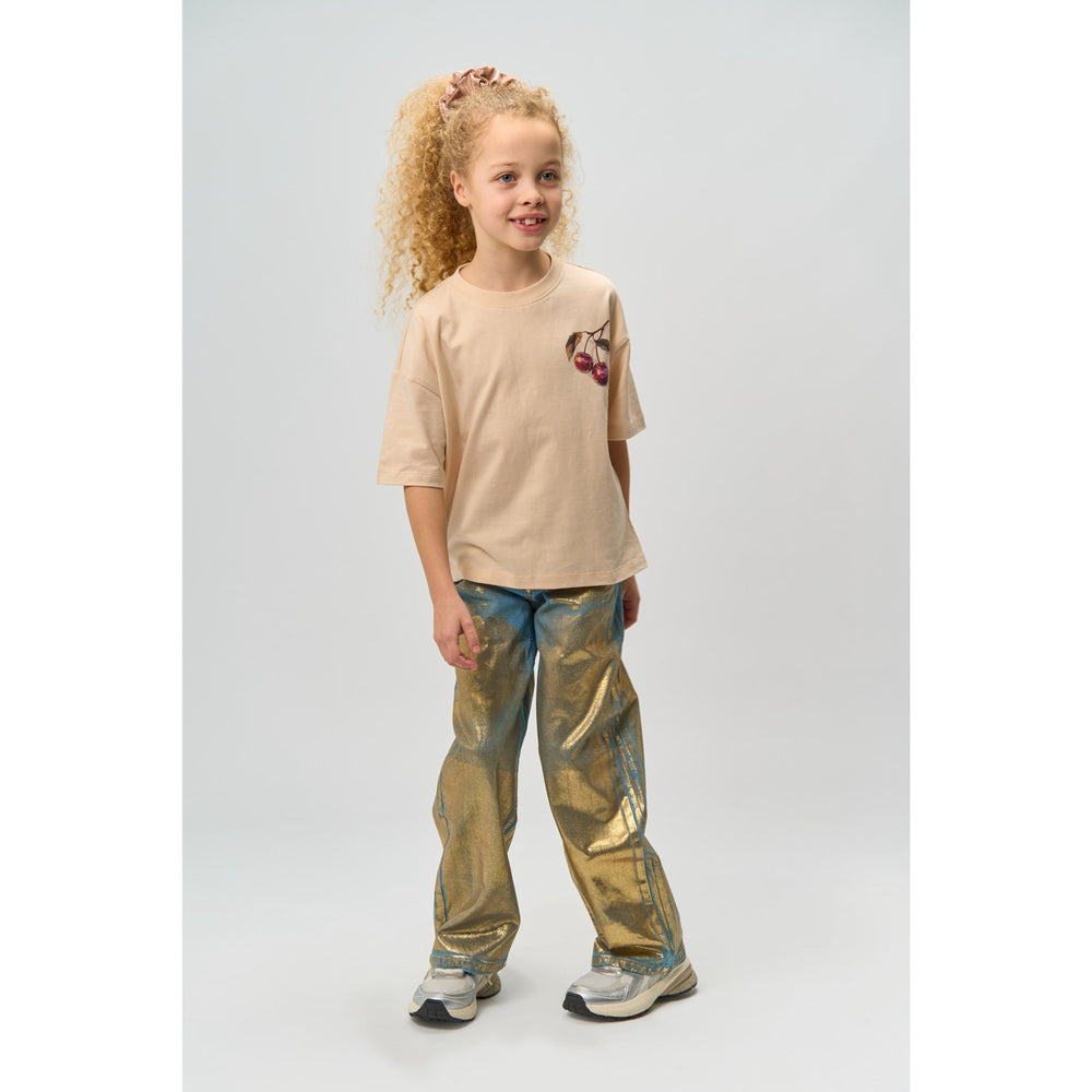Discover the New Light Blue Denim Rosanna Wide Jeans – where style meets comfort. Crafted by THE NEW, these jeans feature a unique gold coating over classic denim, merging streetwear vibes with a touch of glamour. Their wide-leg design not only enhances your child's silhouette but also ensures freedom of movement, making them perfect for both playful days and special occasions. Key features include: - A wide-leg fit that offers a modern and flattering look. - Soft denim material embellished with a striking gold coating for a distinct style. - Traditional jean elements like pockets and belt loops to maintain functionality. These jeans ensure easy care and lasting comfort with their mid-rise waist and relaxed fit. Whether it's a day at the park or a festive gathering, the New Light Blue Denim Rosanna Wide Jeans are an ideal choice for both versatility and style. Embrace a blend of comfort, functionality, and chic aesthetics with this stellar addition to your child's wardrobe.