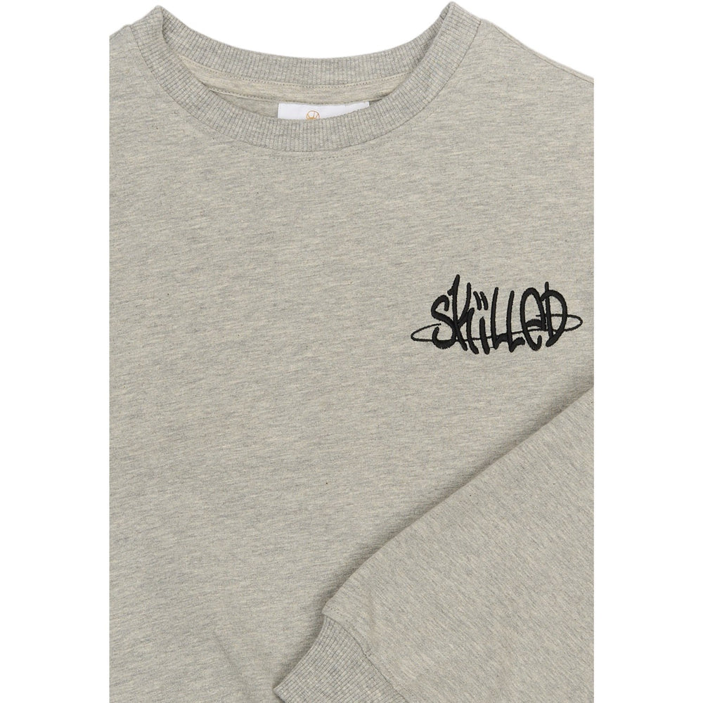 Pleasantly crafted in a neutral light grey mélange, this piece is versatile enough for countless outfit combinations and features an engaging "Skilled" text on the chest with an artistic large print on the back highlighted by two blue dice, introducing a playful edge to the design. This sweatshirt aims to combine fashion with functionality, making it an indispensable addition to your child's wardrobe.