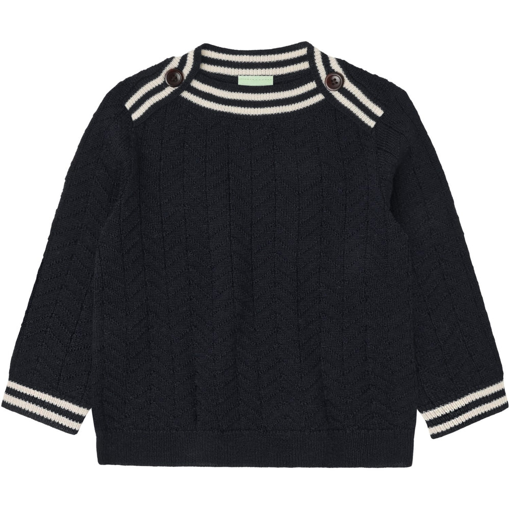 Discover the perfect blend of style and comfort with our FUB Dark Navy Baby ZigZag Blouse. Crafted from 100% OEKOTEX®, BLUESIGN®, and RWS-certified merino wool, this charming knitted blouse is designed for your baby's delicate skin. It features a striking zigzag pattern and a sophisticated dark navy hue, complemented by a ribbed neckline and practical button closure made from natural corozo nut. The regular fit, ribbed cuffs, and hem ensure a polished look with every wear.