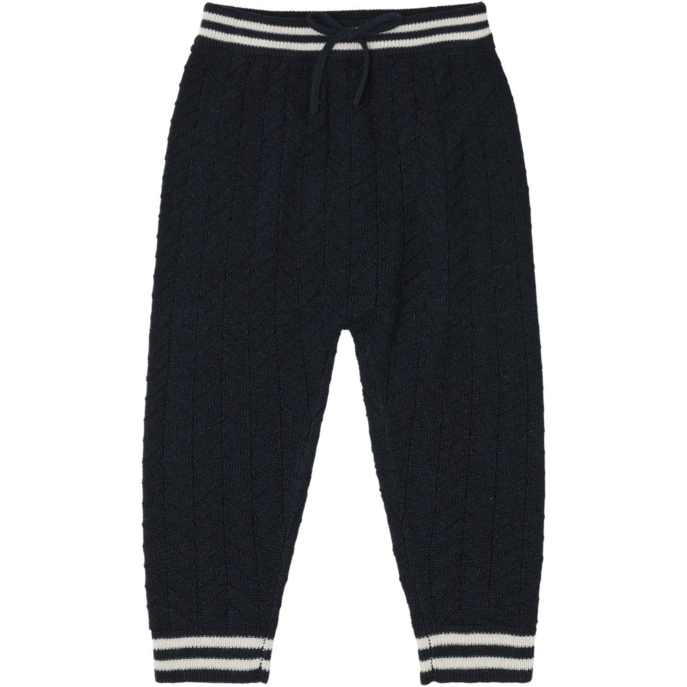 Discover the perfect blend of style and sustainability with our FUB Dark Navy Baby ZigZag Pants. Crafted from 100% OEKOTEX®, RWS, and BLUESIGN® certified merino wool, these pants ensure your little one enjoys supreme softness without any harmful chemicals. The charming zigzag knit pattern, coupled with a smart dark navy hue, adds a dash of playful style, while the relaxed fit and low crotch design enhance comfort. An elastic waistband with a decorative drawcord bow, along with ribbed cuffs, ensures a snug fit that’s easy to slip on and off. Plus, the eco-friendly yarn treatment allows for easy machine washing, making these pants as practical as they are stylish. Ideal for daily wear, they offer both comfort and durability for any child's wardrobe.