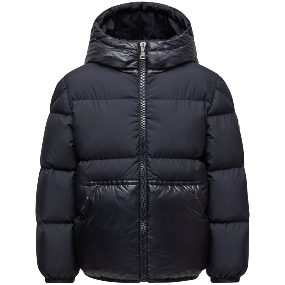 Wrap your little explorer in the cozy embrace of the Moncler Navy Barin Jacket. Glossy meets matte in this stylish puffer design, made from premium polyester with a snug down fill. It boasts a protective hood, secure zip closure, and handy kangaroo pockets. Elastic cuffs and hem ensure a perfect fit that keeps the warmth in and the cold out. This jacket is just right for playful adventures, no matter the weather!