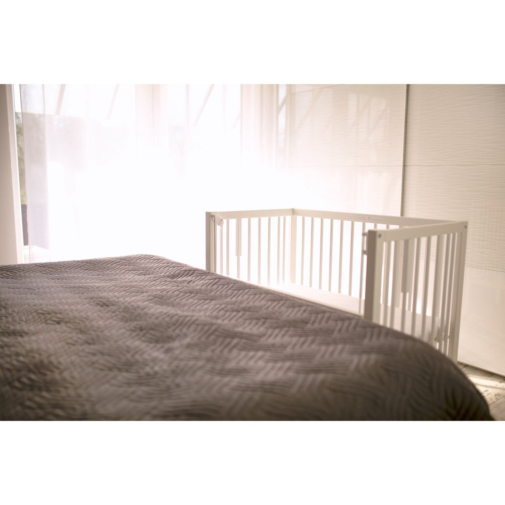Discover the tiSsi® White Lacquer Sophie Crib, masterfully crafted from solid beech, to offer a secure and serene sleeping environment for your infant. Designed for functionality, this crib features lockable, adjustable heights (39-61 cm) compatible with standard adult beds. It includes a modifiable side panel that transforms swiftly between open and closed configurations, ensuring close parental proximity for enhanced safety and comfort through the night. The crib rests on lockable wheels, ensuring stability yet easy maneuverability. The minimalist white lacquer finish blends seamlessly into any nursery theme, supporting both aesthetics and durability. Perfect for growing with your child, the tiSsi® crib also educates by fostering early independence and security. Accessories such as custom-fit mattresses and textiles are available to complement this elegant piece. Materials: Solid beech white lacquer Measurements: 45 x 82 x 95 cm Washing instructions: The tiSsi® cot SOPHIE should only be wiped with a damp cloth and then rubbed with a dry cloth. The colors of the tiSsi® may change due to too much sunlight Certifications: Organic, environmentally friendly and sustainably produced Suitable for a parent bed in height 39-61 cm Locking grille included Brake on all 4 wheels The base can be adjusted in height using stepless adjustment Mattress dimensions: 40 x 90 cm NOTE: Mattress and extra accessories are not included