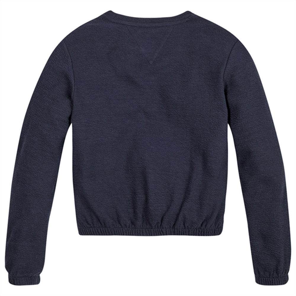 Dress your little one in timeless style with the Tommy Hilfiger Textured Ruffle Sweater in Desert Sky. This charming knitted sweater boasts a delicate ruffle design that adds a touch of elegance. The serene blue hue and cozy material ensure comfort and warmth, perfect for playful days or chilly evenings. Easy to care for and versatile, it's ideal for both casual and dressier occasions, making it a must-have in your child's wardrobe.