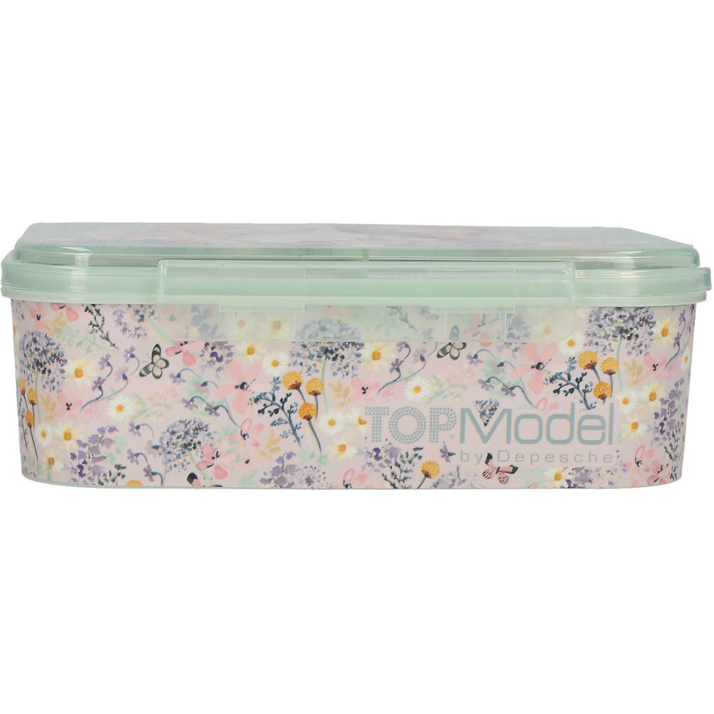 Introduce your little one to the charming TOPModel Summer Feeling Lunchbox, perfect for on-the-go meals. Adorned with intricate flowers, delicate butterflies, and stylish TOPModels, this sage green lunchbox features a one-piece hinged lid with a beautiful all-around print. It's thoughtfully divided into three compartments catering to different-sized snacks and meals. Although it's not suitable for dishwasher or microwave use, the lunchbox is easy to clean by hand, ensuring it stays pristine and always ready for your child's next adventure. This piece combines function and style, making mealtime both fun and organized.