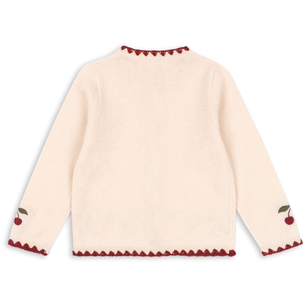 Dress your little one in the cozy elegance of the Konges Sløjd Off White Collette Cardigan. Crafted from 100% pure wool, this supremely soft knitted cardigan features charming cherry embroidery and stylish contrasting fabric trims. The classic mother of pearl buttons ensure a secure and comfortable fit, making it perfect for both casual and more formal gatherings. Easy to care for and irresistibly delicate, it's an ideal addition to your child’s wardrobe that combines both fashion and function. Materials: 100% Wool