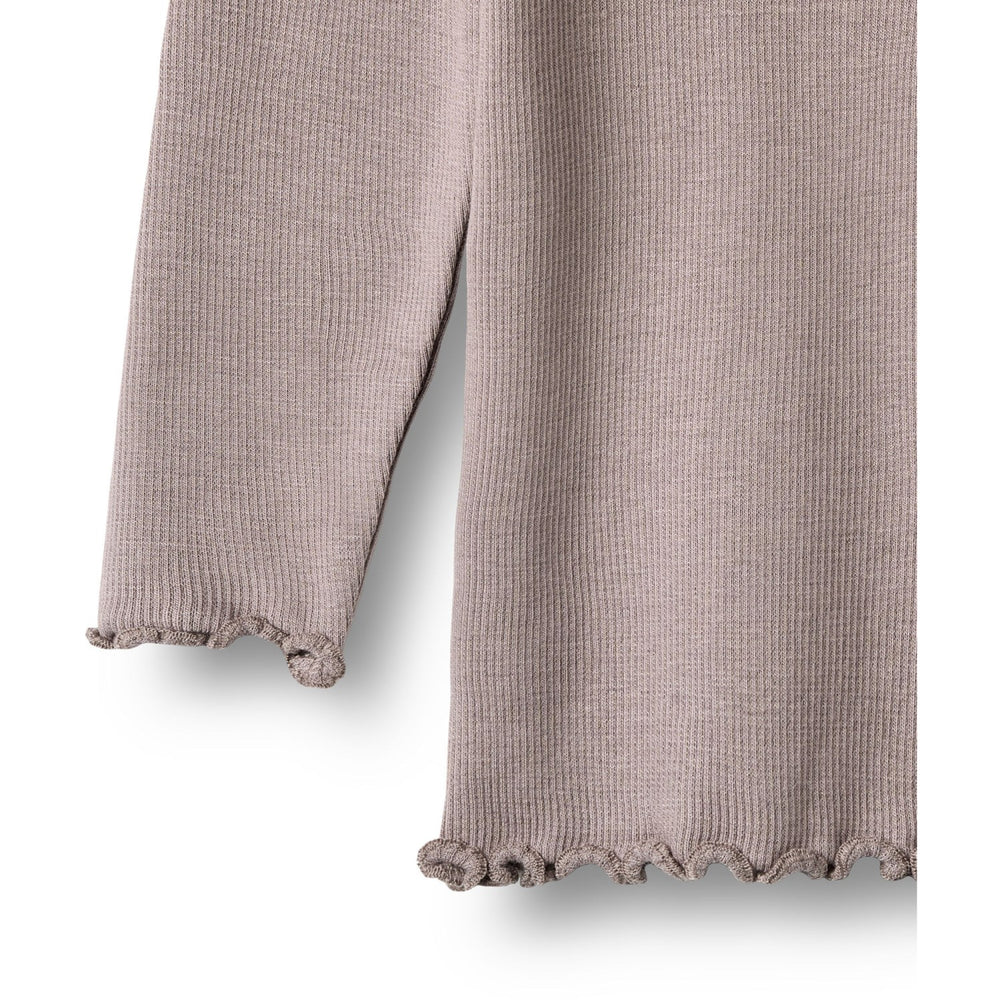 Discover the charming Wheat Dusty Purple Rib Blouse Reese for your little one, crafted from a premium blend of 48% organic cotton and 48% Lenzing modal, enhanced with 4% elastane for a comfortable stretch. This long-sleeved rib T-shirt combines cozy softness with fashionable details, including delicate lace around the neckline and practical press buttons on the left shoulder for easy dressing.