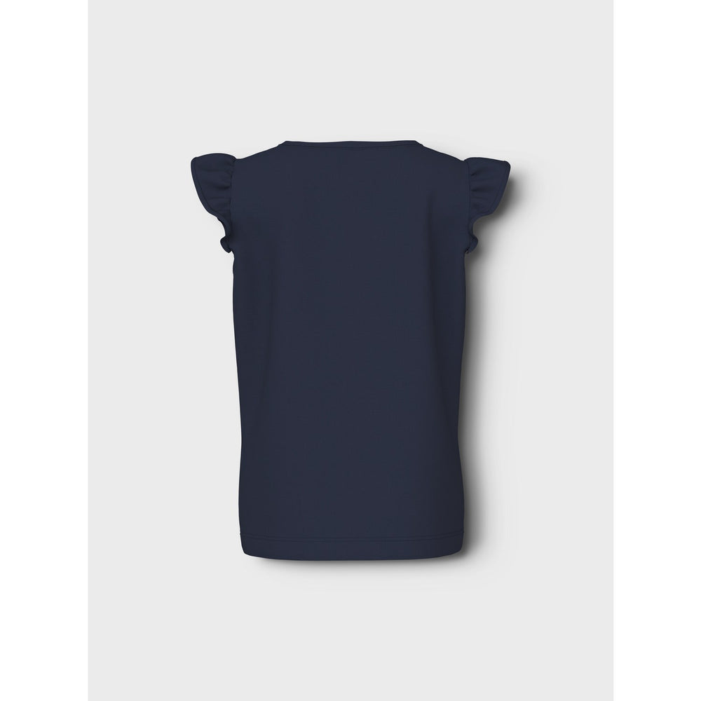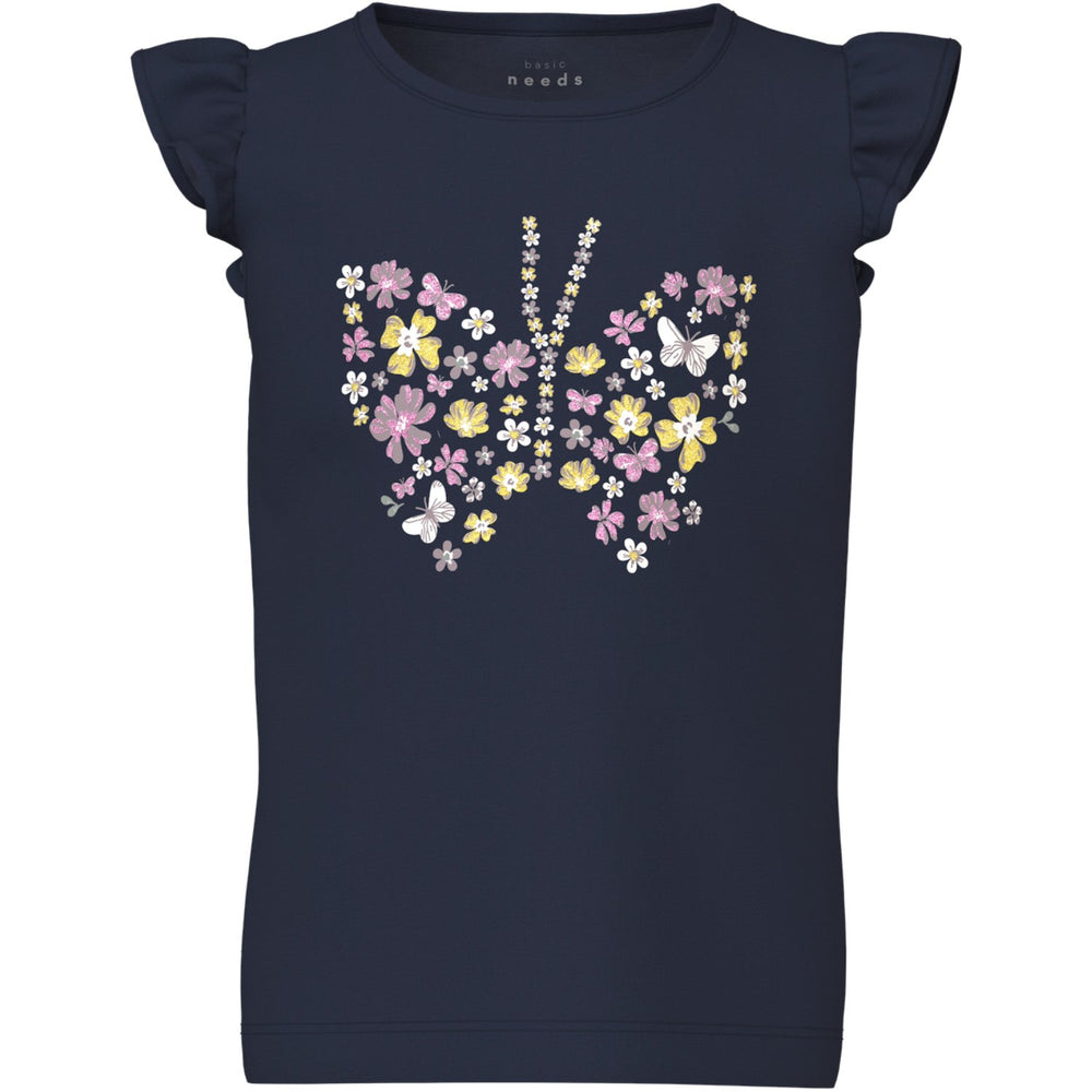 Introducing the vibrant Name It Navy Blazer Butterfly Vayana Capsl Top, a delightful addition to any child's clothing collection. This T-shirt is crafted from a soft, stretchy jersey fabric ensuring comfort and freedom of movement. Showcasing an enchanting butterfly print with a rubber texture for added softness, the top features cap sleeves, and a classic round neck for easy wear. In a regular fit, this piece is ideal for both playdates and parties. Easy to care for, this item blends functionality with a charming style that kids and parents will love.