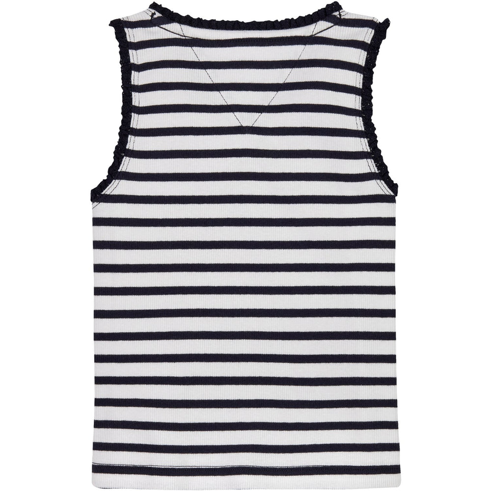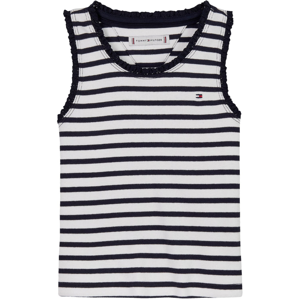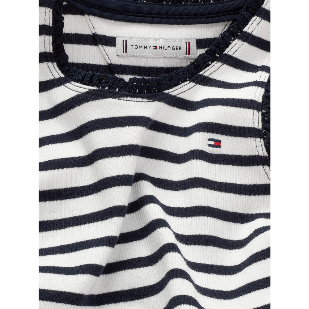 Introducing the charming Tommy Hilfiger Dark Night Navy Stripes Essential Rib Lace Tank Top, perfect for your little one's wardrobe. Crafted with soft, ribbed fabric and featuring a stylish lace trim, this tank top offers a snug fit and lasting comfort. The classic navy with subtle stripes and a signature brand touch adds a splash of elegance. Ideal for both casual outings and playtime, it's a staple piece that combines durability with effortless style.