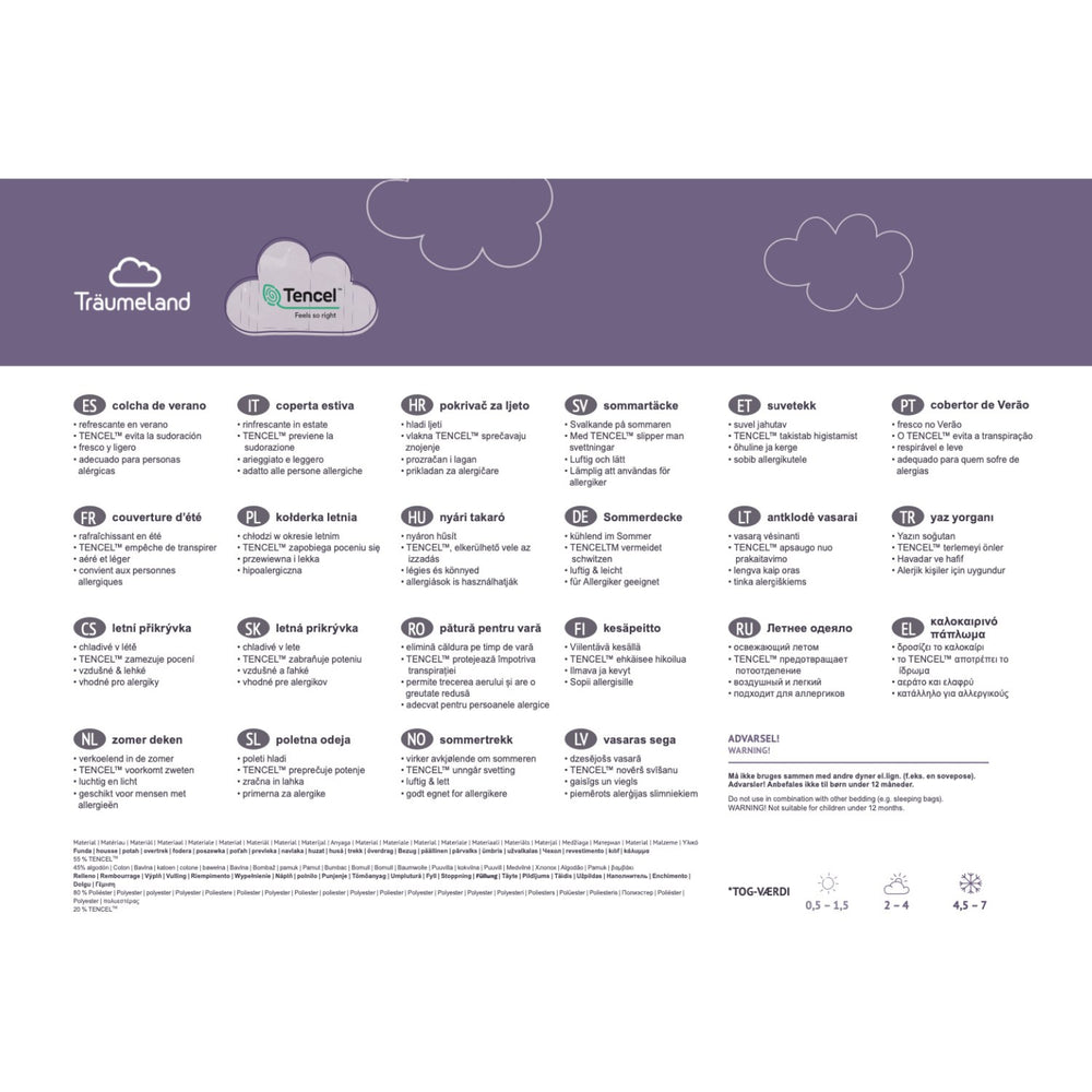 Introduce comfort to your baby's summer nights with the Träumeland Summer Duvet Mare Baby. Crafted with 55% TENCEL™ natural fibre and awarded the OEKO-TEX STANDARD 100 certification, this lightweight, airy duvet guarantees a cool, sweat-free sleep. Its TOG value of 2.0 ensures optimal temperature regulation, making it perfect for allergy sufferers. Enjoy ease of maintenance with this machine-washable, beautifully designed piece, all made in Austria. Let your baby experience the gentle embrace of safety and comfort, night after dreamy night.
