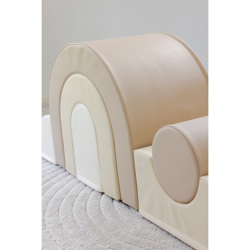 This educational toy features seven unique foam parts, including arches and soft shapes, that provide a variety of playful challenges. Children can explore climbing, crawling, and balancing activities, all while engaging in imaginative play. Made from high-quality, stable foam and covered in kid-friendly vegan leather, the pieces offer a sturdy yet soft surface that is also easy to clean, making it perfect for daily play.