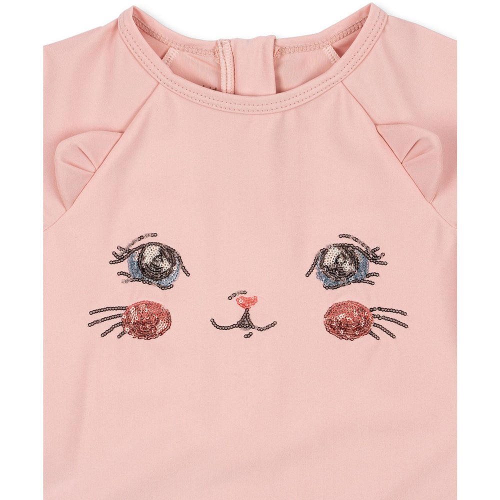 Introducing the charming Konges Sløjd Powder Pink Kitty Onesie, designed to keep your little one safe and stylish during water play. This adorable long-sleeved swim onesie not only features a delightful pink color and playful kitty pattern but is also crafted with UPF 40+ fabric for excellent sun protection. Its comfortable fit ensures freedom of movement, making it ideal for both pool and beach adventures. Easy to care for, it's a perfect blend of practicality and style.